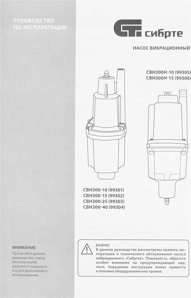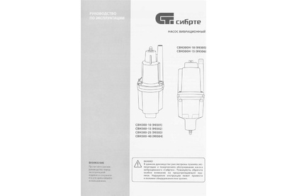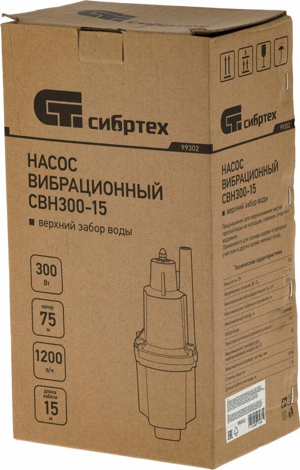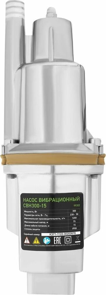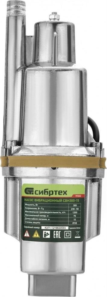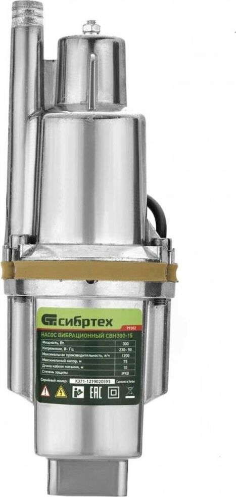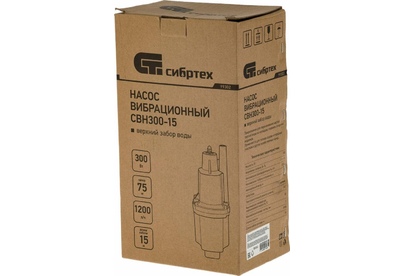 Вибрационный насос СИБРТЕХ СВН300-15, верхний забор, 300 Вт, напор 75 м, 1200 л/ч, кабель 15 м 99302