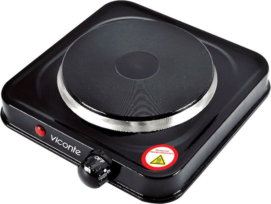 Плитка электрическая одноконфорочная, настольная, мощность: 1000 Вт, диаметр чугунной конфорки 155 мм, дисковый нагревательный элемент, прочное легкоочищаемое термостойкое эмалевое покрытие, защита от перегрева, плавная регулировка температуры, световой индикатор работы.