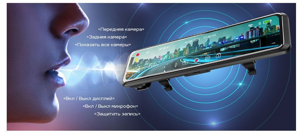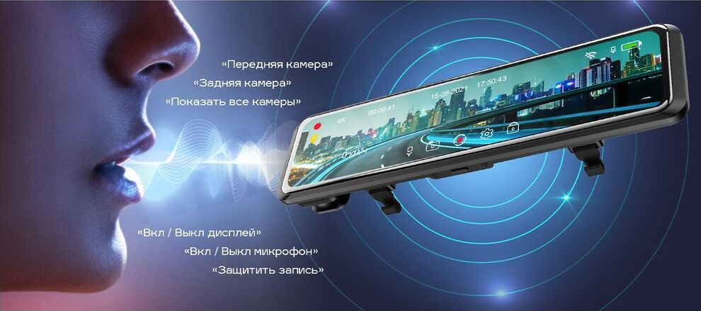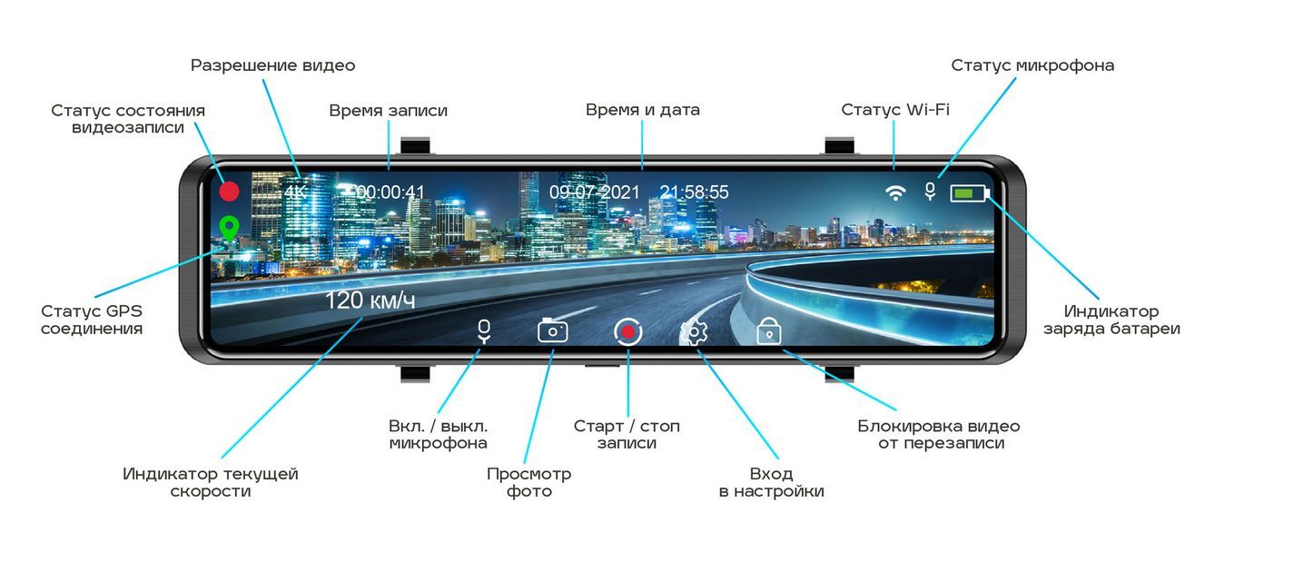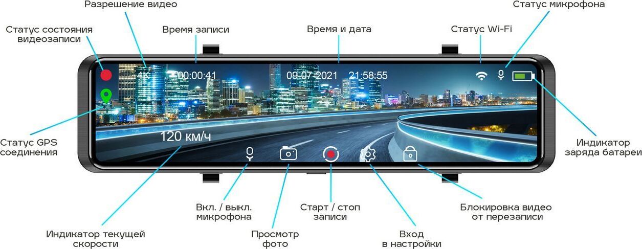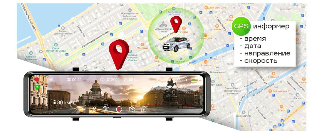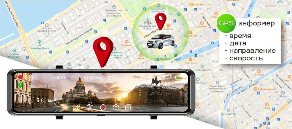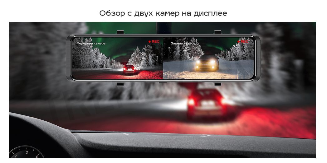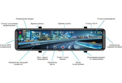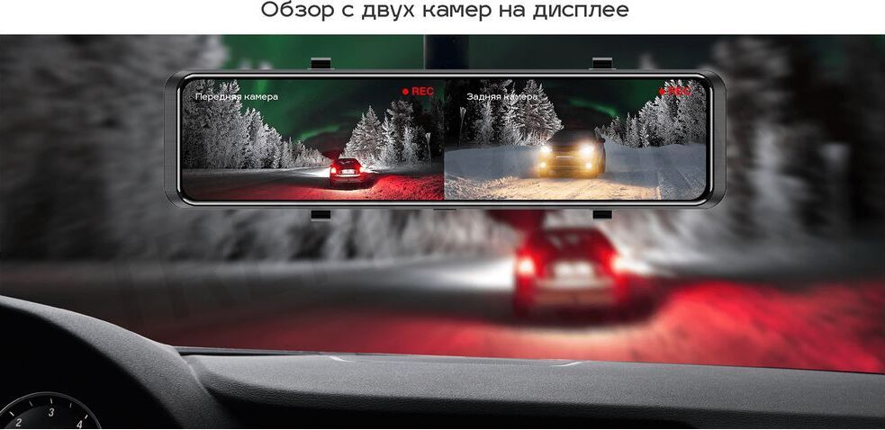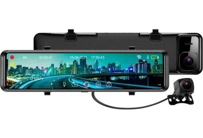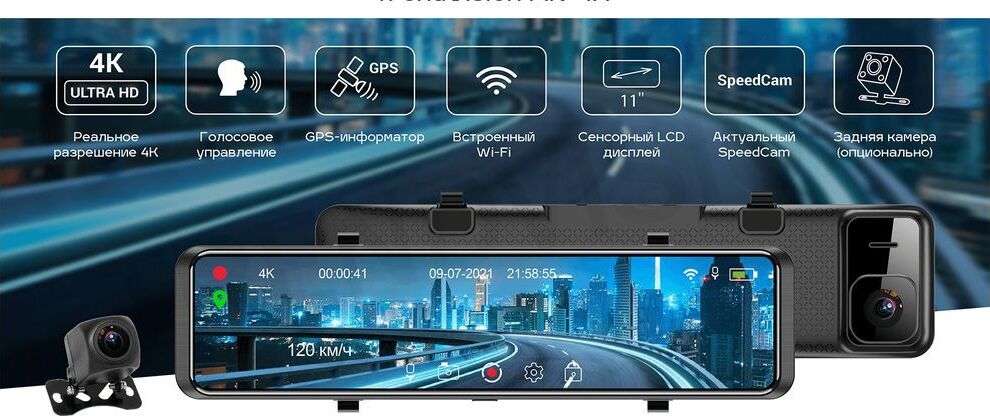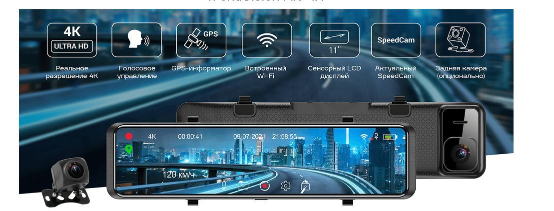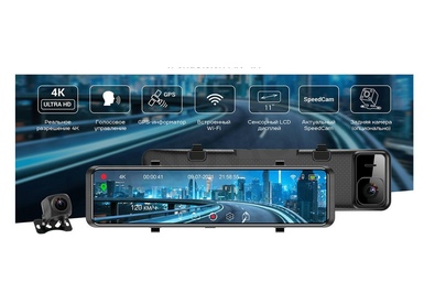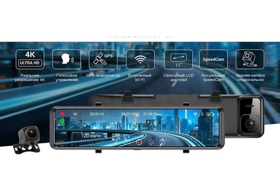 автомобильный видеорегистратор в форме зеркала с двумя камерами (Real 4K Ultra HD + Full HD), работающий на новейшей матрице Sony IMX415 с 8Мп и скоростном процессоре Hi3559. Начинка аппарата составляет самые современные, необходимые для мощного видеорегистратора, возможности. Не интерполированное, реальное разрешение видео 4К Ultra HD Современная 8-Мегапиксельная матрица Sony IMX 415 Сенсорный экран 11", на котором можно производить настройки, просматривать видео и получать полезную информацию для безопасной езды GPS-информер с системой предупреждений о радарах и камерах SpeedCam Настройка, управление и просмотр видео через мобильное приложение (благодаря встроенному Wi-Fi) Задняя Full HD камера с парковочными линиями Обзор с двух камер на дисплее видеорегистратора Возможность записи на базе умного видео-кодека H.265