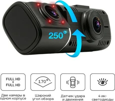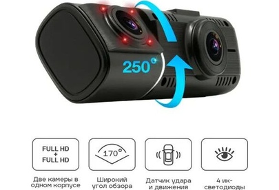 две камеры на одной оси, вторая камера: макс. разрешение видеозаписи 1920х1080 30 к/с, угол поворота 250⁰ , аккумуляторная батарея для аварийного сохранения файлов, комплектация: видеорегистратор, крепление на присоске, кабель питания, документация