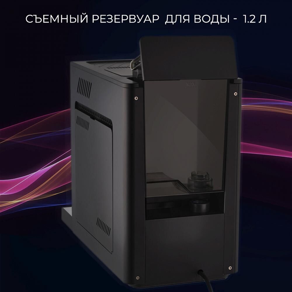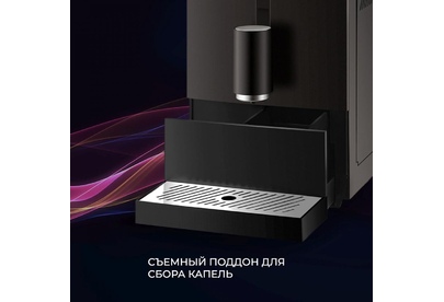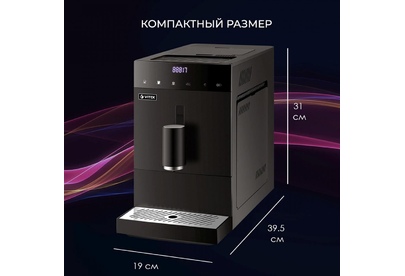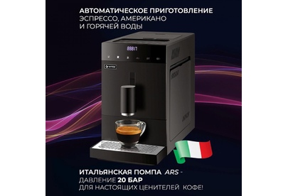 Кофемашина автоматическая. Мощность: 1100-1350 вт, Давление помпы: 20 бар, Съемный резервуар для воды: 1,2 литра, Программирование объёма порции кофе, Одновременное приготовление двух чашек, Емкость контейнера для зерен, Индикатор уровня воды, Индикация включения, Контейнер для отходов, Контроль крепости кофе, Подача горячей воды, Подогрев чашек, Подсветка дисплея, Приготовление эспрессо, Регулировка порции горячей воды, Регулировка степени помола, Регулировка температуры кофе, Съемный лоток для сбора капель, Автоматическая декальцинация, LED-Дисплей, Встроенная кофемолка, Материал корпуса: пластик, Особенности: Приготовление эспрессо, американо и горячей воды одним касанием дисплея / Встроенная жерновая кофемолка с 5 степенями помола, Регулировка жесткости воды, ип используемого кофе: зерновой, Итальянская помпа фирмы ARS, Цвет: Черный