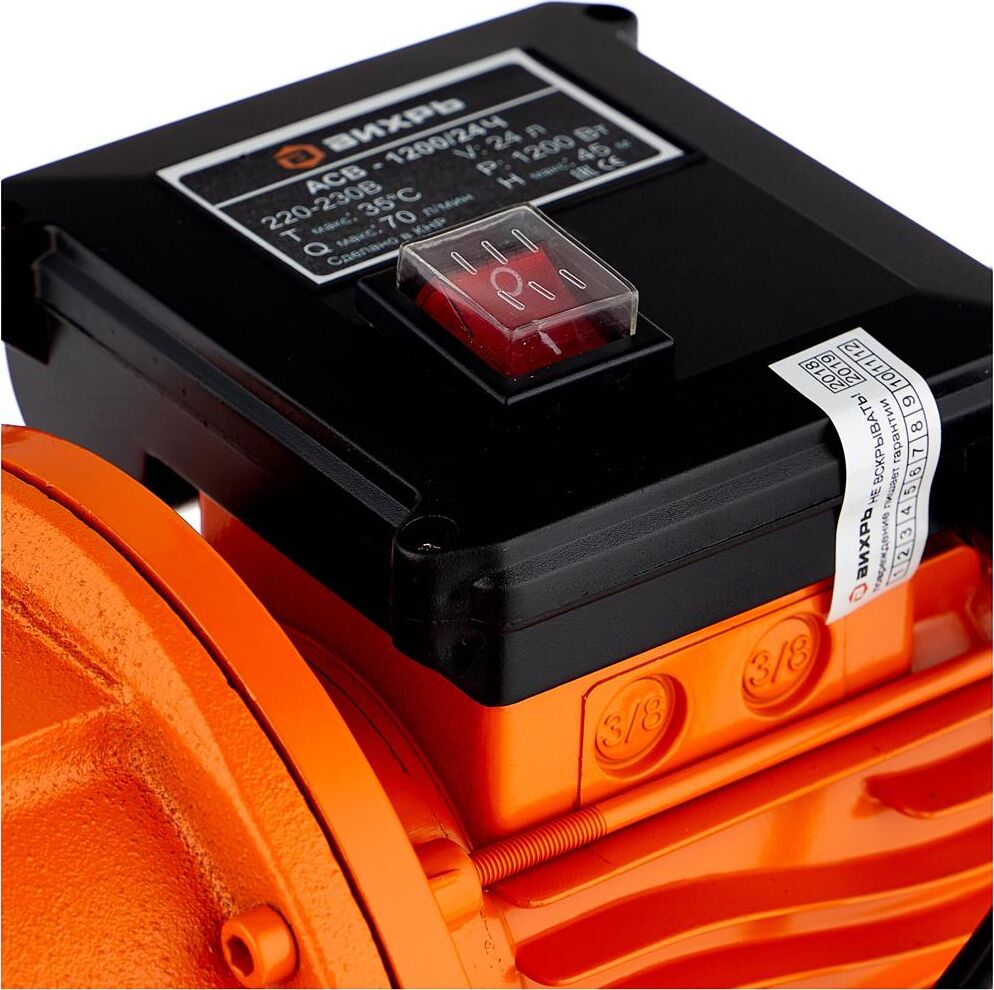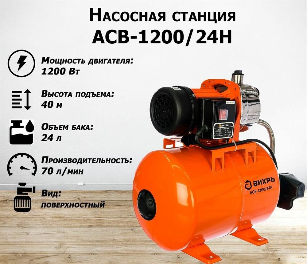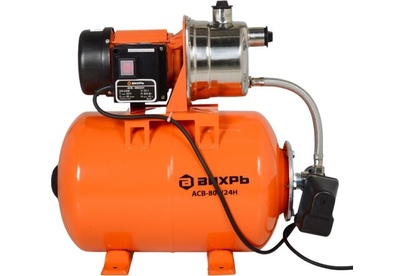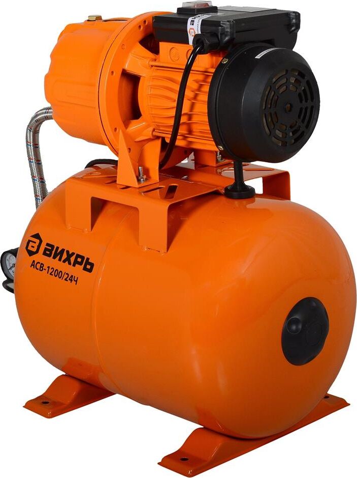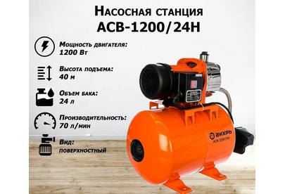 Насосная станция ВИХРЬ АСВ-1200/24Ч. Мощность, Вт – 1200; Емкость гидроаккумулятора, л – 24; Максимальный напор, м - 45; Максимальная подача, л/мин – 70; Материал корпуса насоса – чугун;
