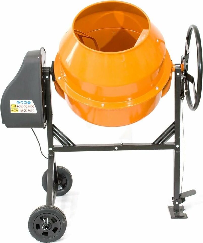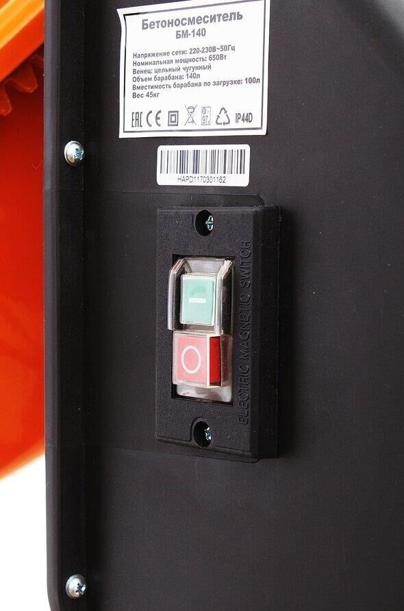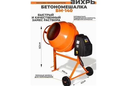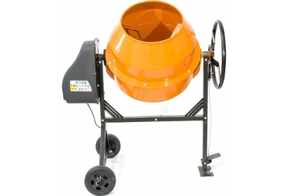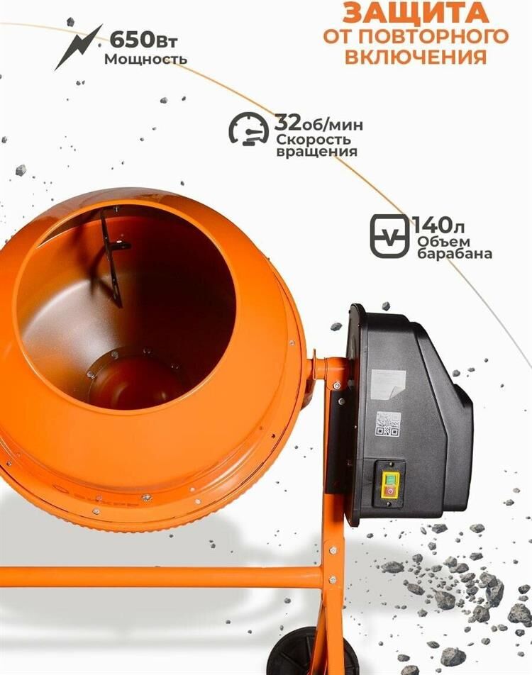 Мощность 650Вт, объем барабана 140л, вместимость барабана по загрузке 100л, диаметр отверстия барабана 375мм, скорость вращения барабана 29,5 об/мин, время приготовления порции смеси 3-7мин, венец чугунный, габариты 770х690х430 мм, вес 48кг.