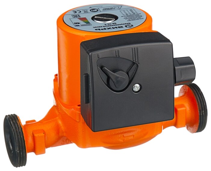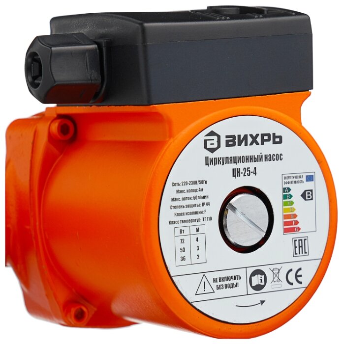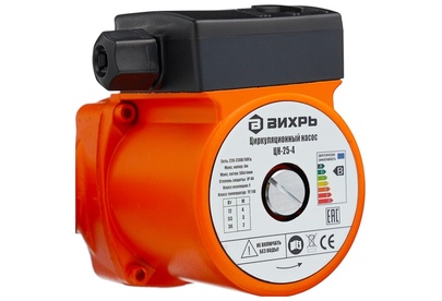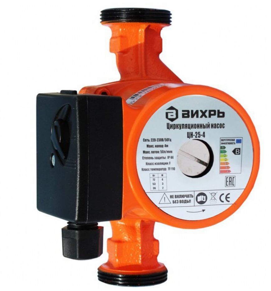 Циркуляционный насос Вихрь Ц-25-4. Мощность, Вт – 36/53/72; Напор, м – 2/3/4; Максимальный поток, л/мин – 50; Резьба на насосе, дюйм – 1,5;