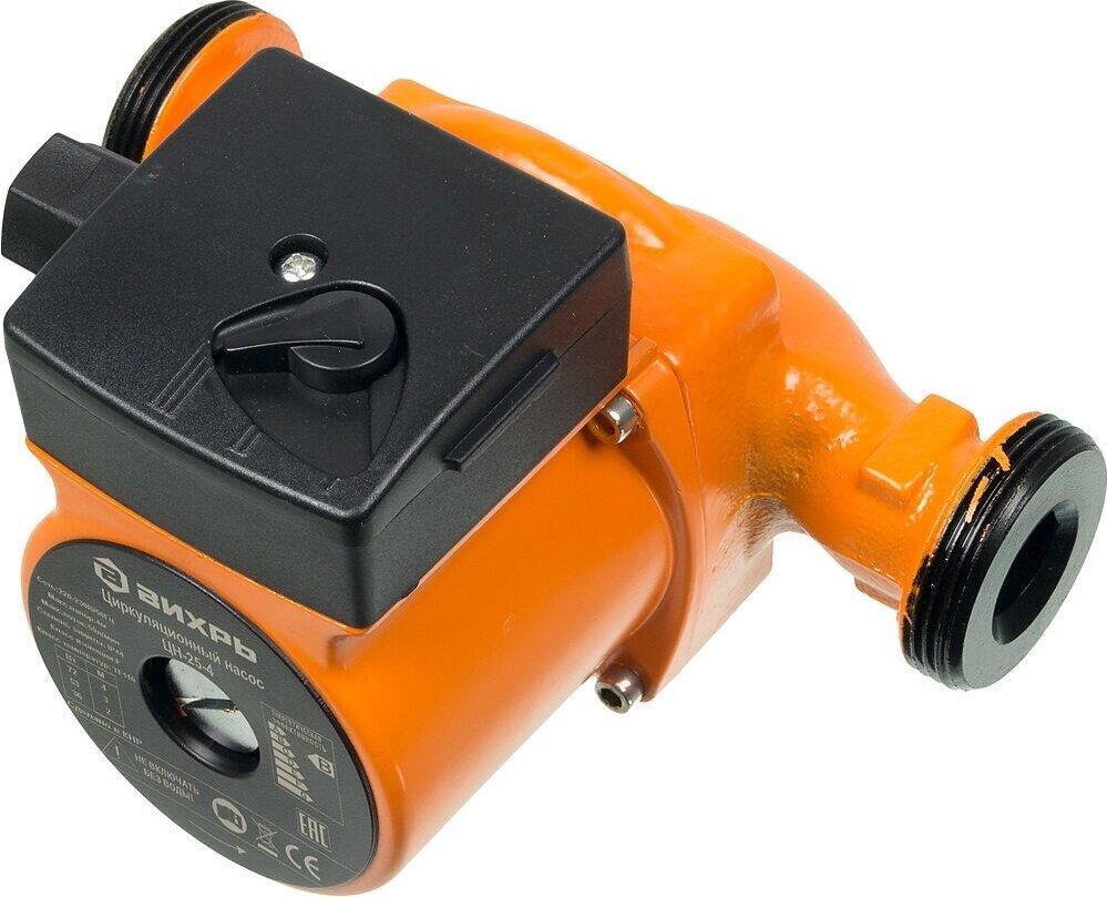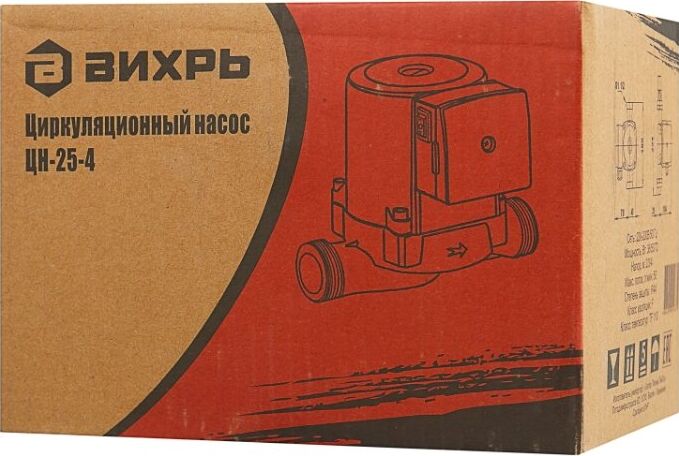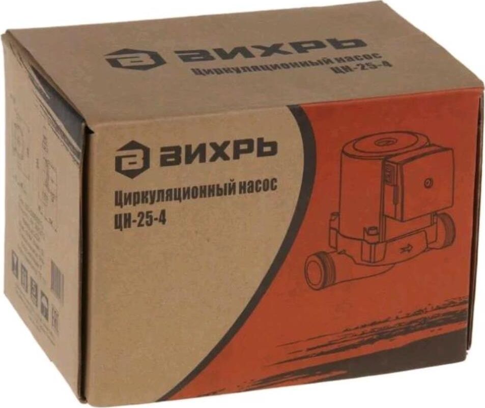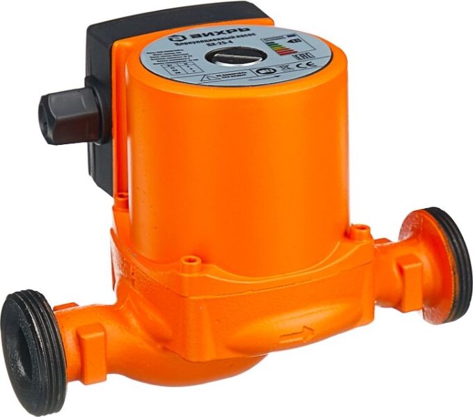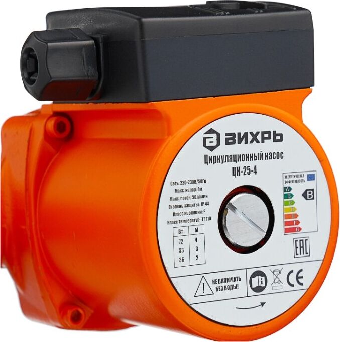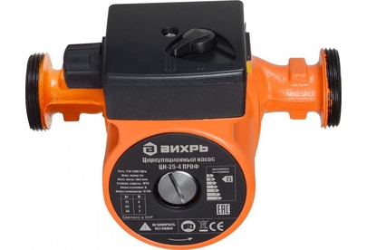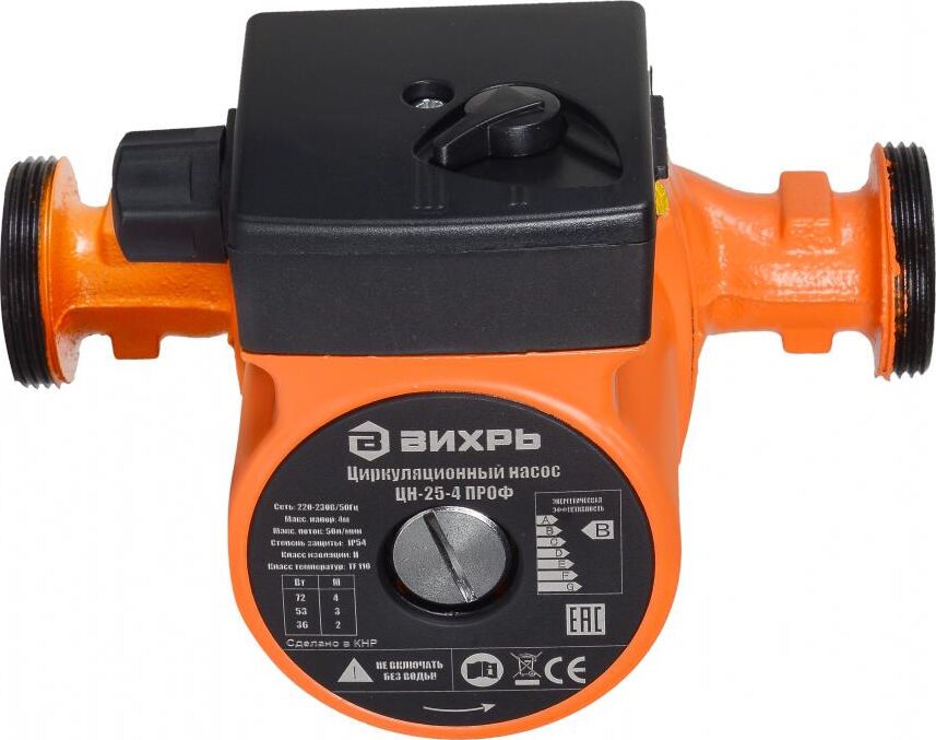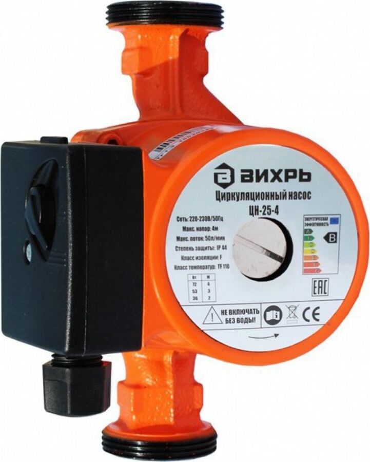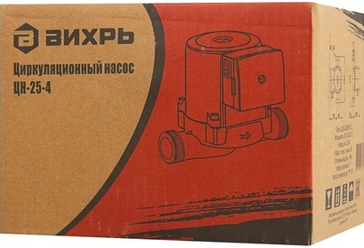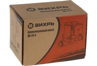 Циркуляционный насос Вихрь Ц-25-4. Мощность, Вт – 36/53/72; Напор, м – 2/3/4; Максимальный поток, л/мин – 50; Резьба на насосе, дюйм – 1,5;