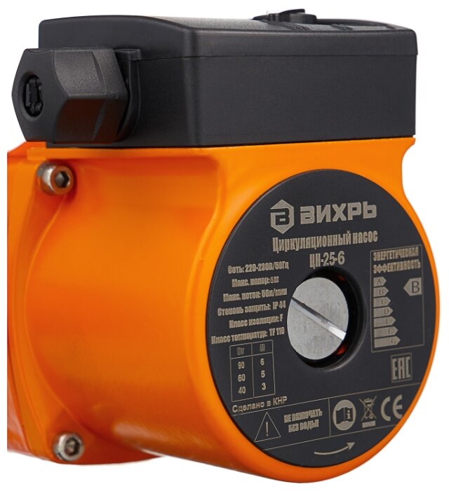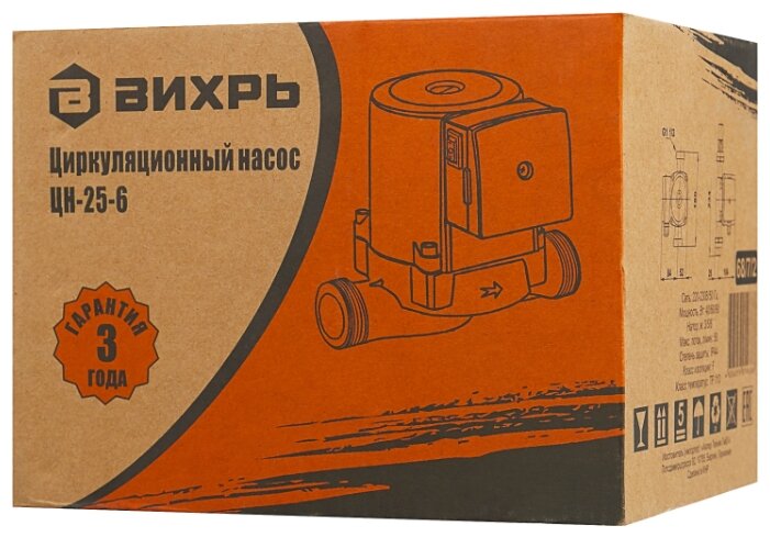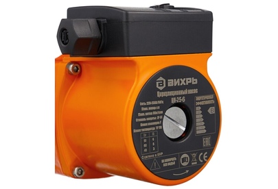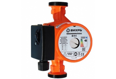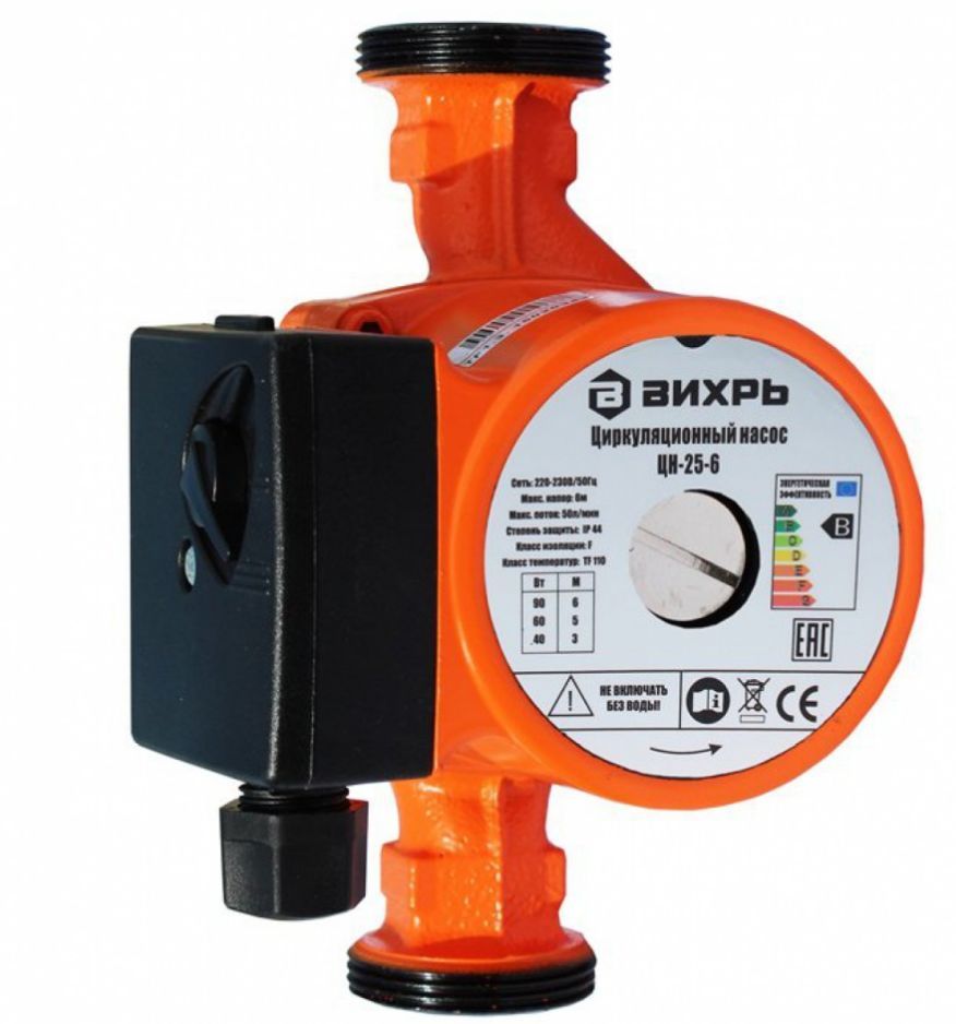 Циркуляционный насос Вихрь Ц-25-6. Мощность, Вт – 40/60/90; Напор, м – 3/5/6; Максимальный поток, л/мин – 50; Резьба на насосе, дюйм – 1,5;