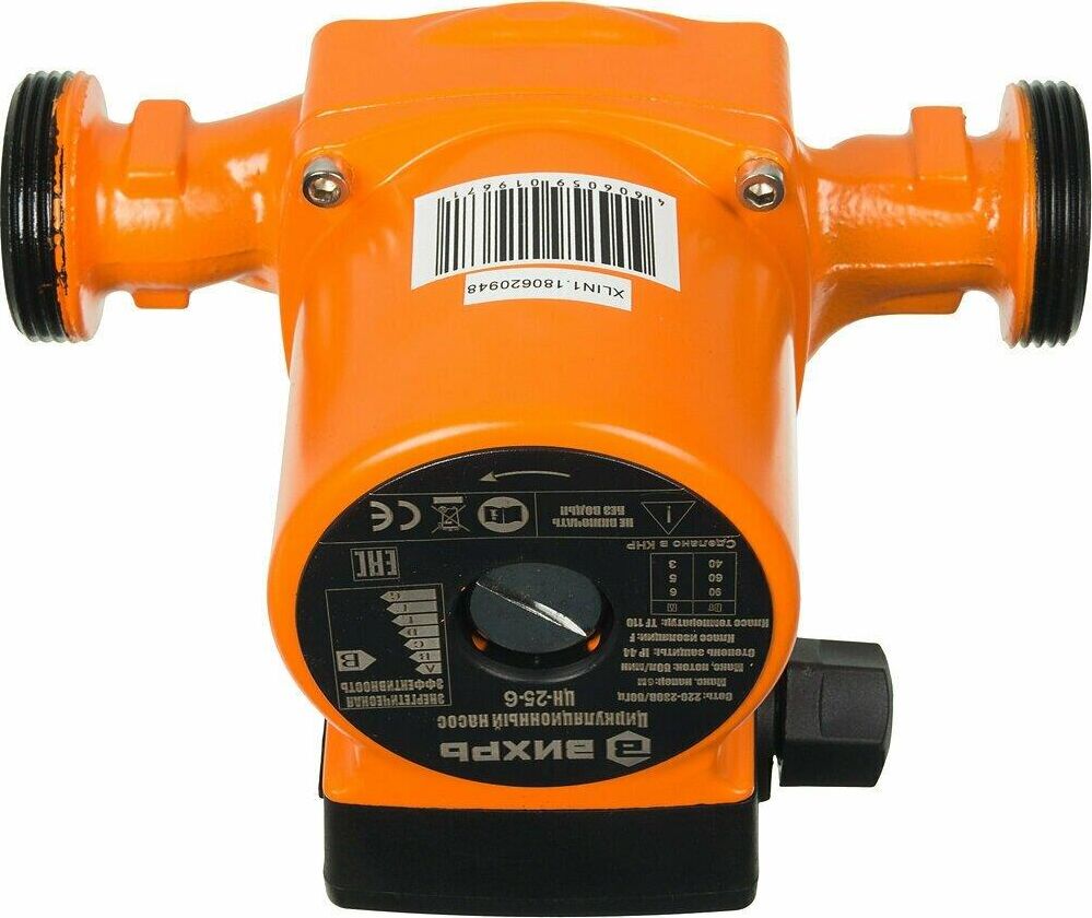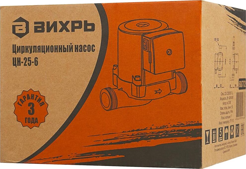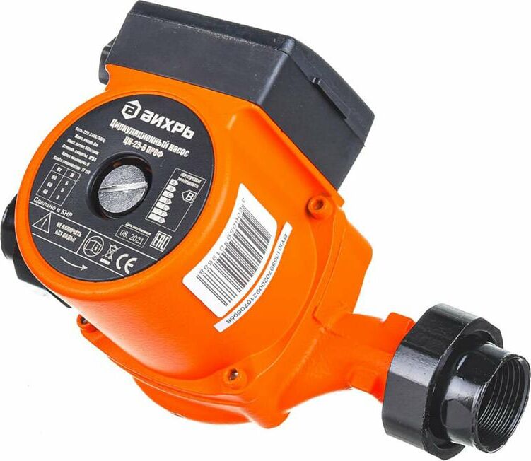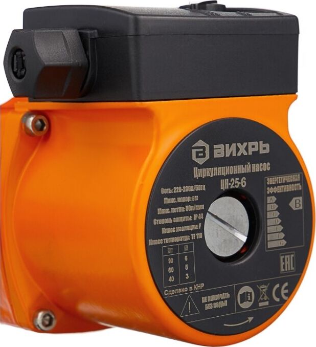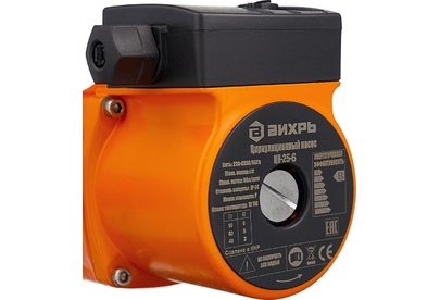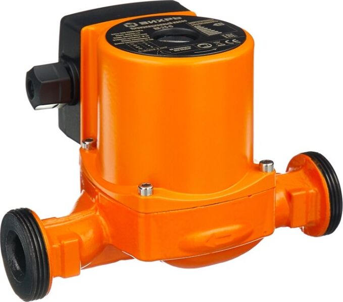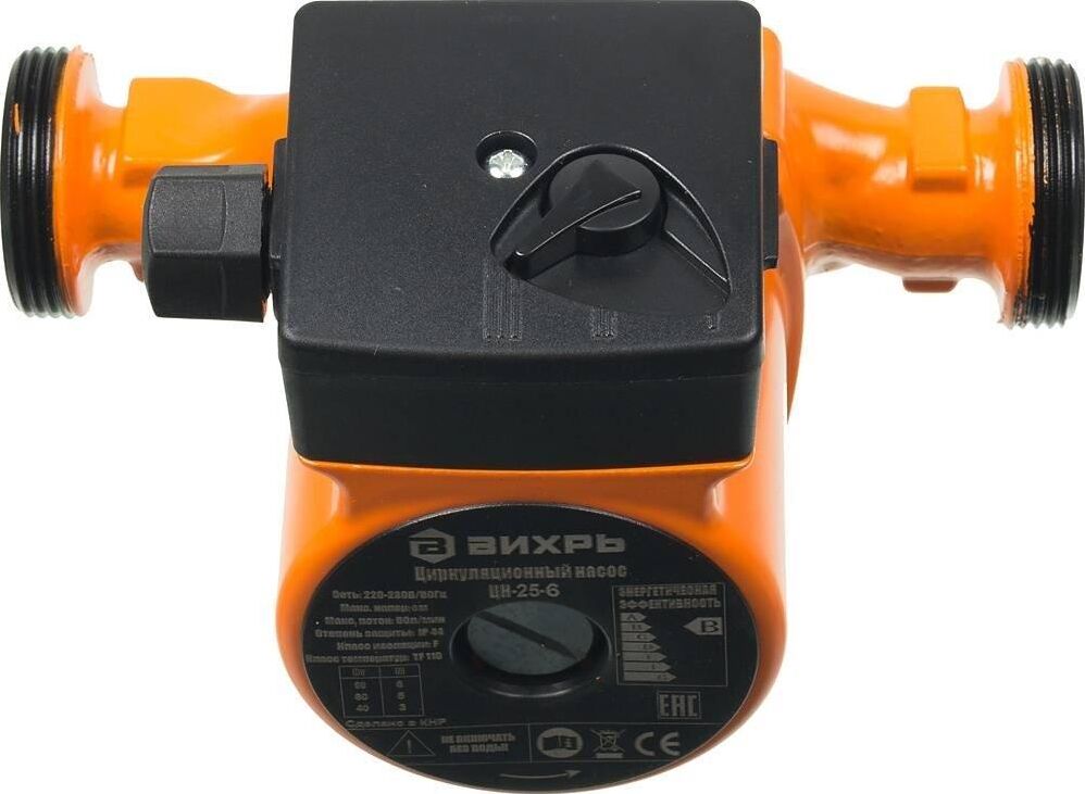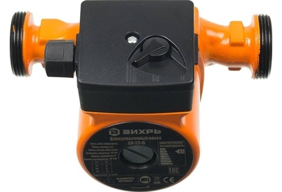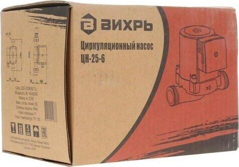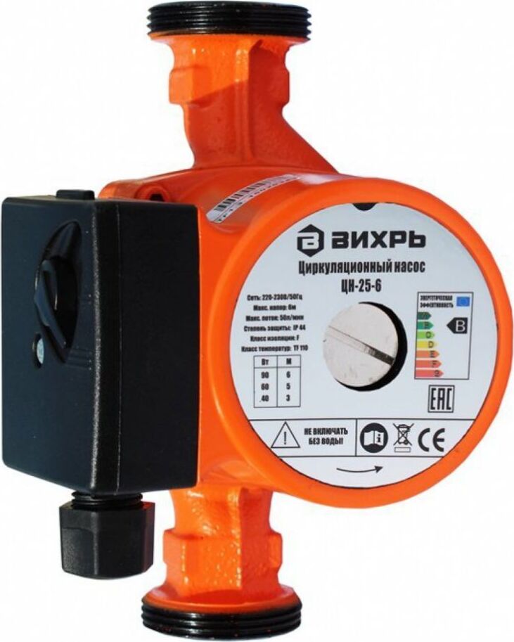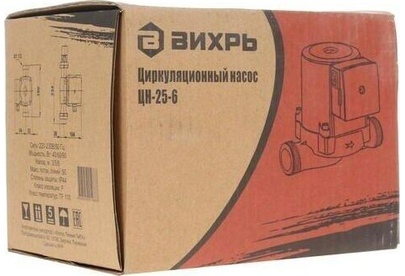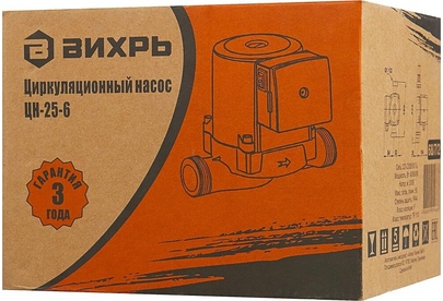 Циркуляционный насос Вихрь Ц-25-6. Мощность, Вт – 40/60/90; Напор, м – 3/5/6; Максимальный поток, л/мин – 50; Резьба на насосе, дюйм – 1,5;
