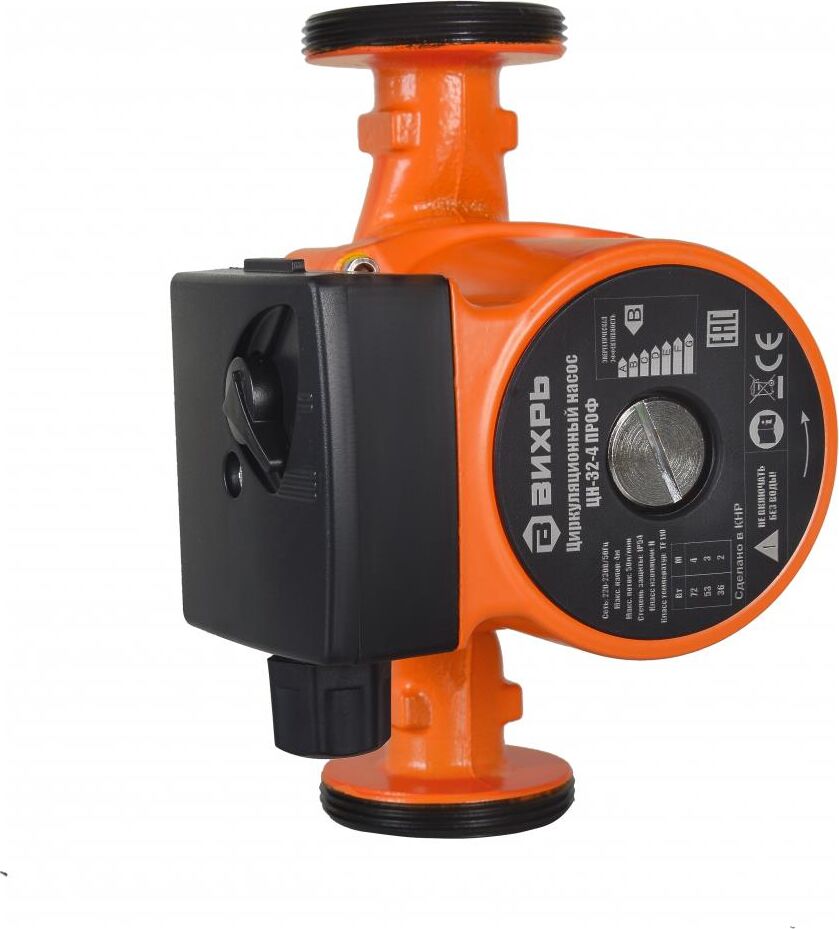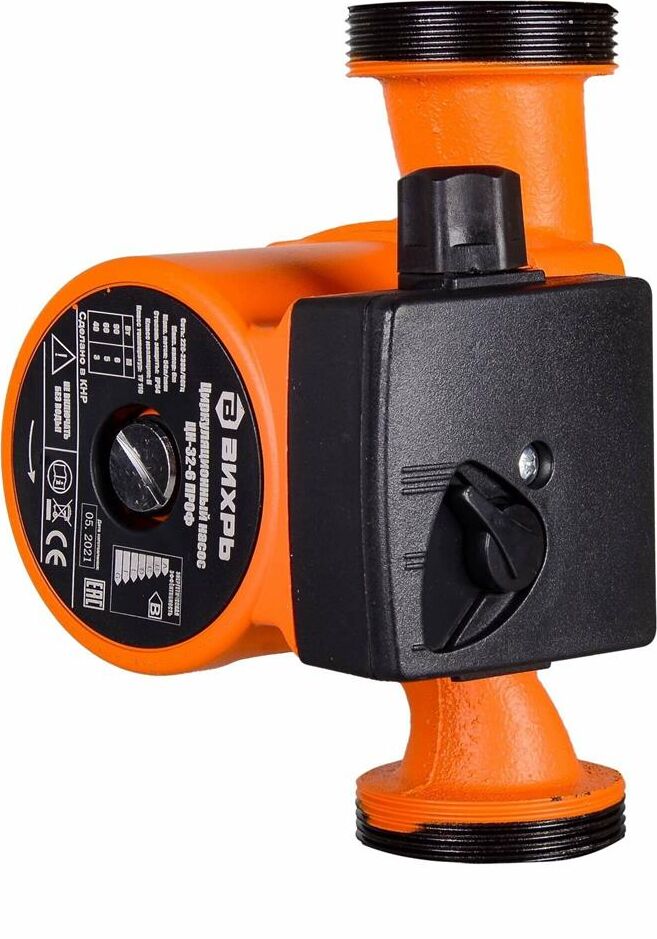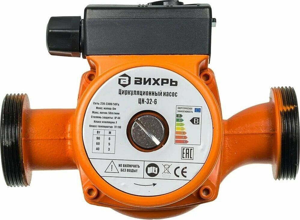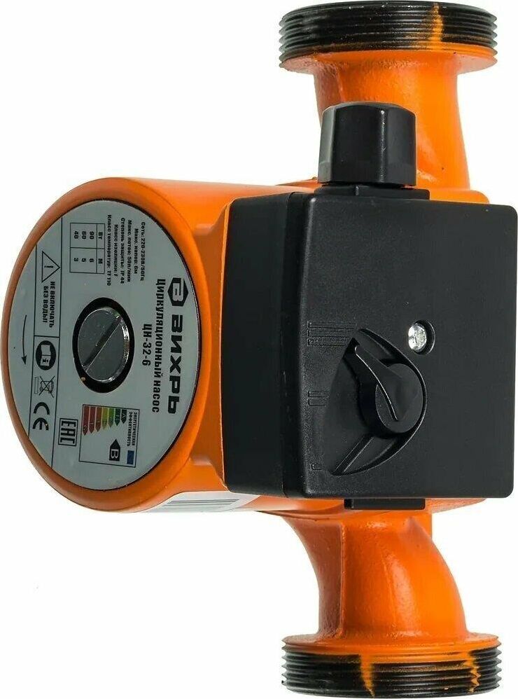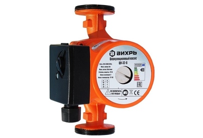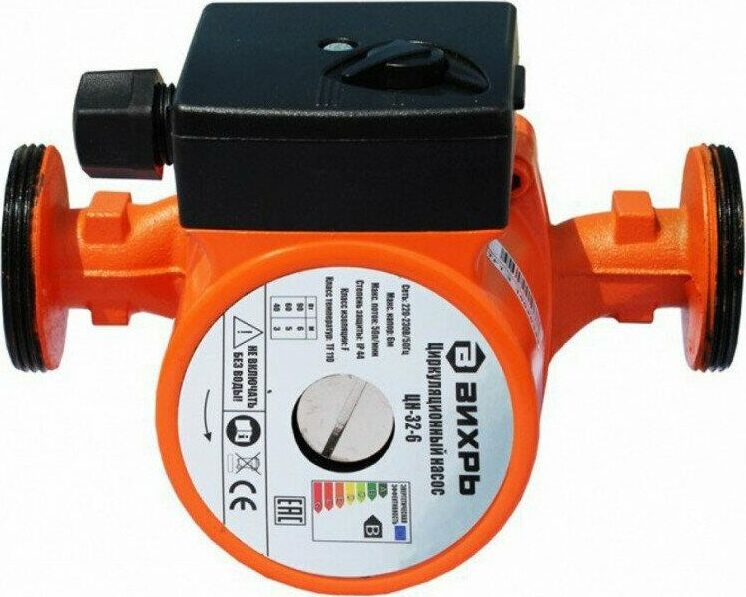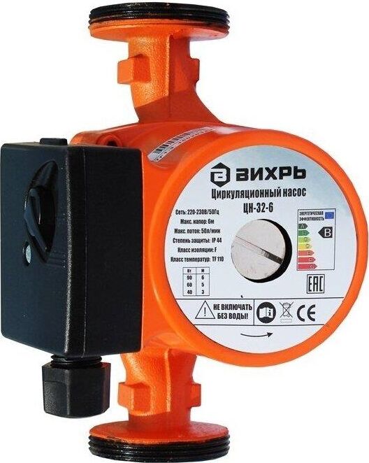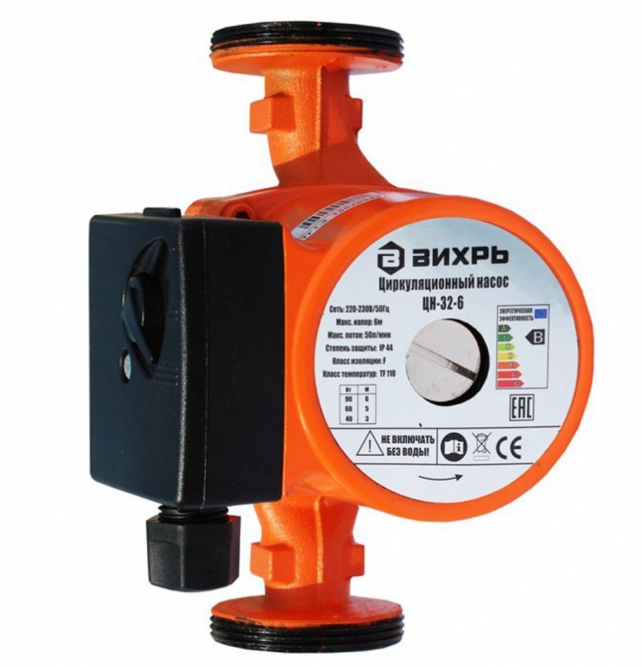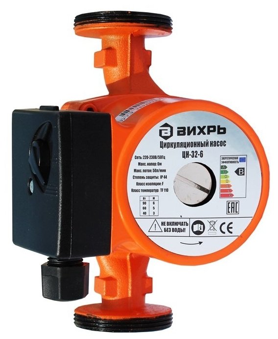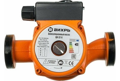 Циркуляционный насос Вихрь Ц-32-6. Мощность, Вт – 40/60/90; Напор, м – 3/5/6; Максимальный поток, л/мин – 50; Резьба на насосе, дюйм – 2;