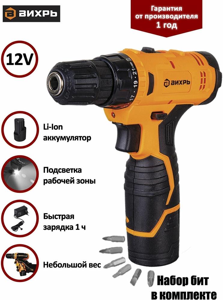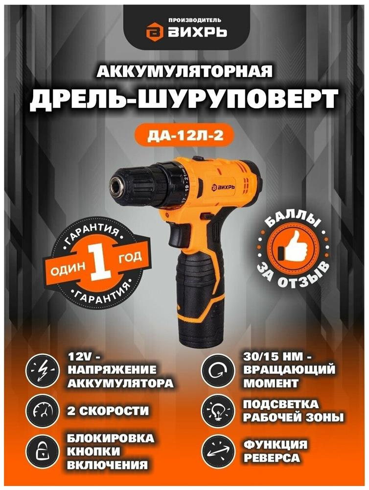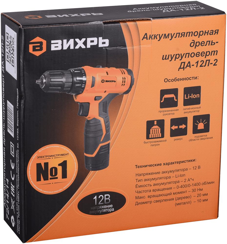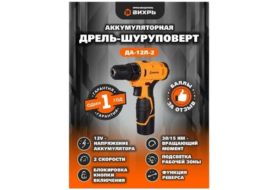 Дрель-шуруповерт. Напряжение аккумулятора - 12В. Емкость аккумулятора - 2А*ч. Тип аккумулятора - Li-Ion. Вращающий момент - 30Нм. Число оборотов - 0 - 400об/мин. Число оборотов (для 2 скорости) - 1400об/мин. Число ступеней крутящего момента - 21+1. Тип основного патрона - быстрозажимной.
