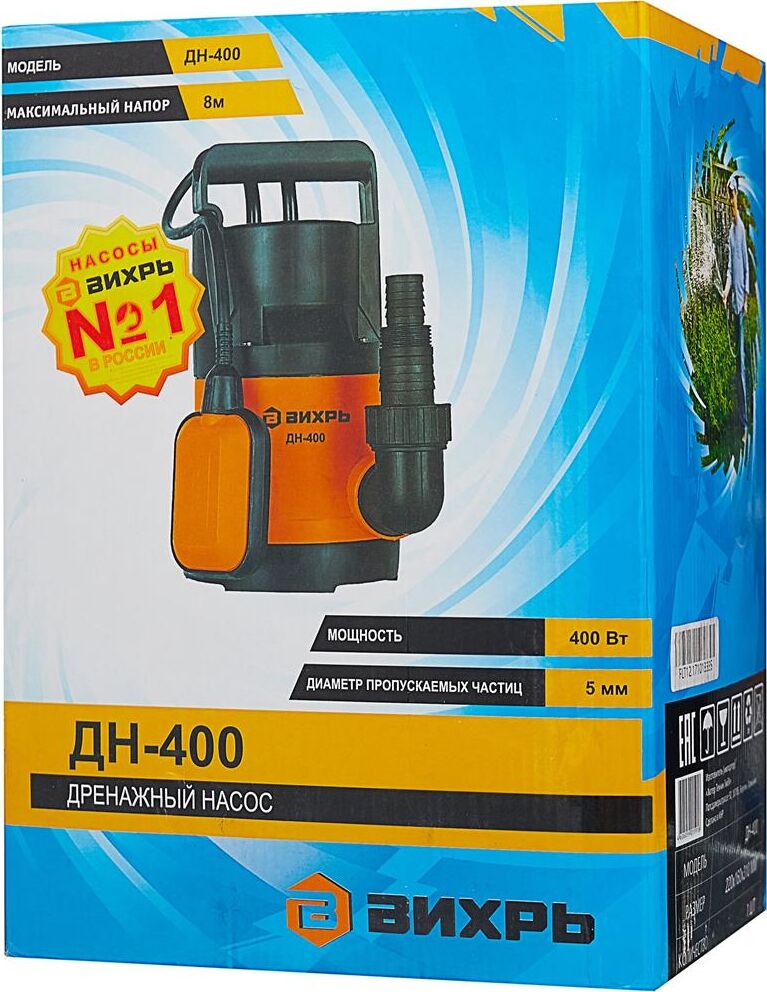 Мощность 400Вт, максимальная высота подъема 8м, максимальная подача 11,3 м3/час, диаметр пропускаемых частиц 5мм, материал корпуса пластик, электродвигатель асинхронный, однофазный с короткозамкнутым ротором.