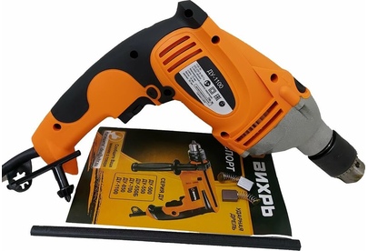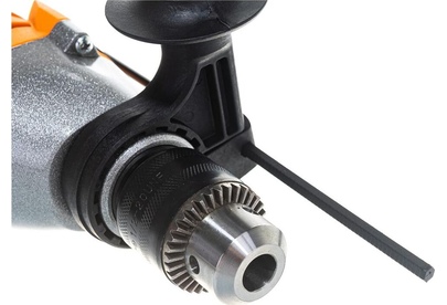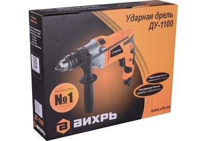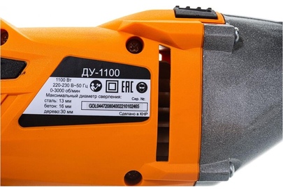 1100 Вт, число оборотов на холостом ходу 0-3000 об/мин, диаметр сверления сталь/дерево/бетон 10/25/13 мм, патрон ключевой 1,5-13 мм, вес - 2.3 кг.