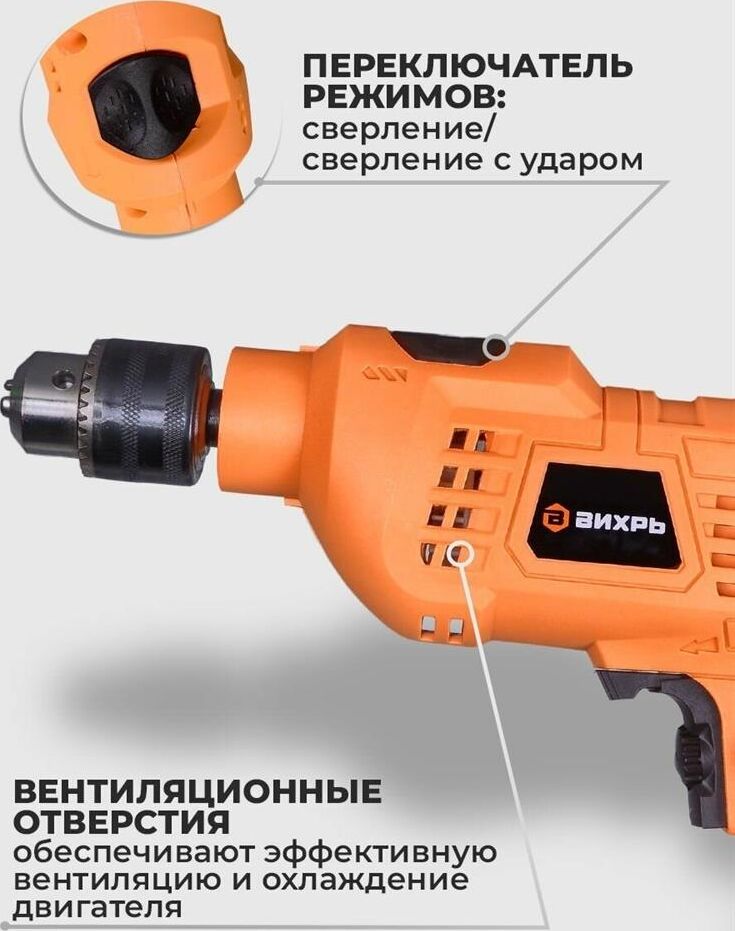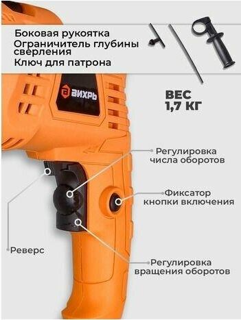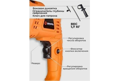 дополнительная рукоятка, ограничитель глубины сверления, блокировка кнопки включения