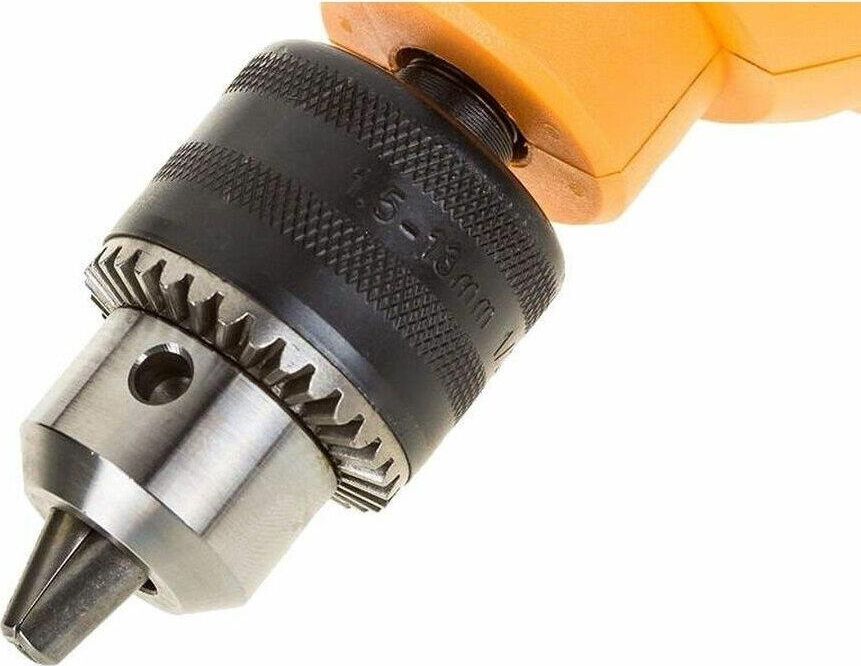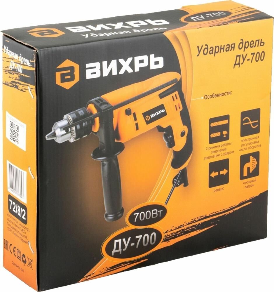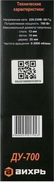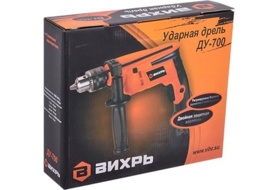700 Вт, число оборотов на холостом ходу 0-3000 об/мин, диаметр сверления сталь/дерево/бетон 10/25/13 мм, патрон ключевой 1,5-13 мм, вес - 1,8 кг.
