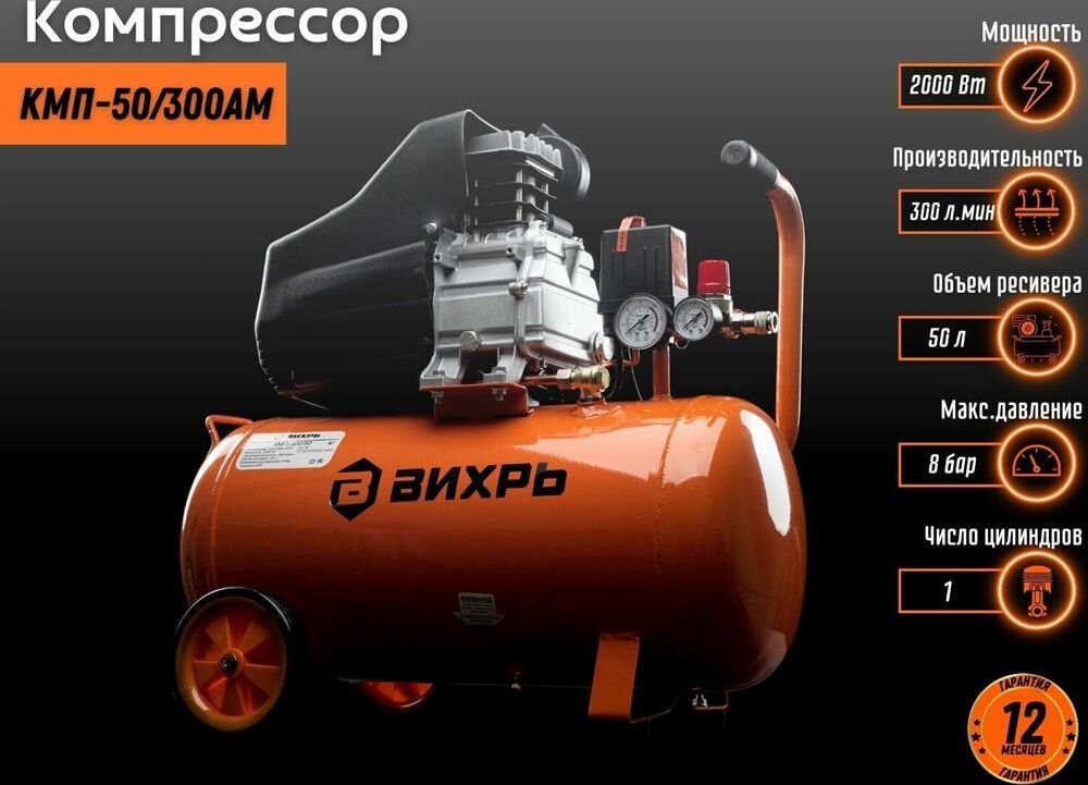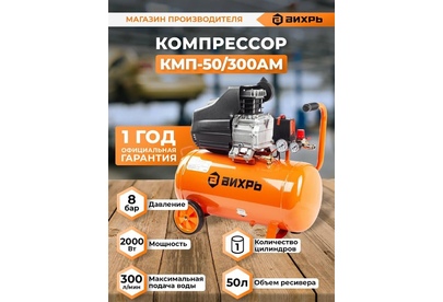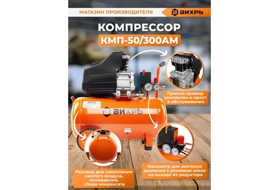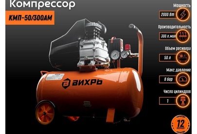 ВИХРЬ Компрессор поршневой КМП-50/300АМ масляный 300л/мин 50л 2000Вт оранжевый
