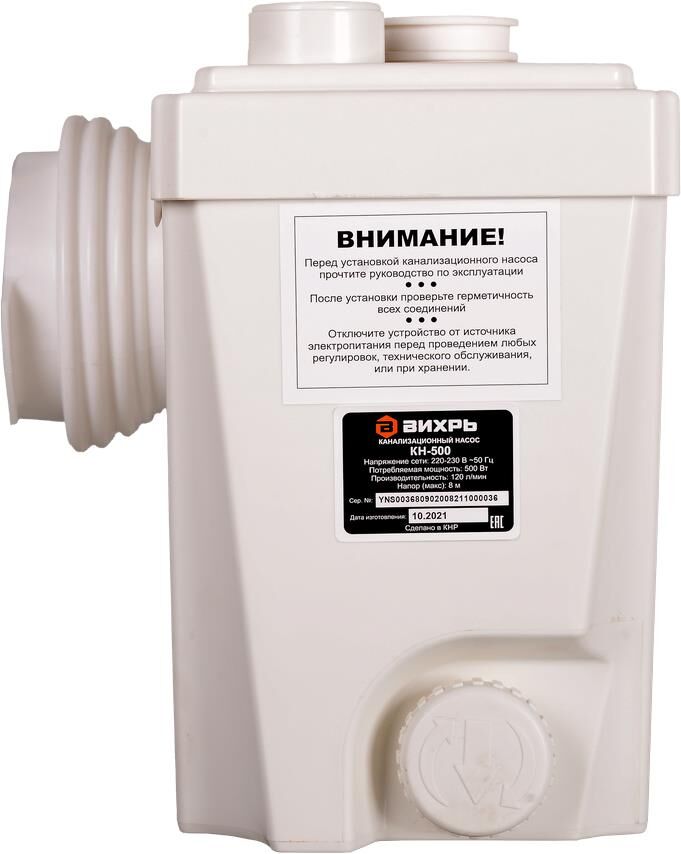500 Вт, 120 л/мин, макс. напор по вертикали – 8 м, по горизонтали – 80 м, 3 входа, вход под унитаз, ножи, реверс, до +60 °С