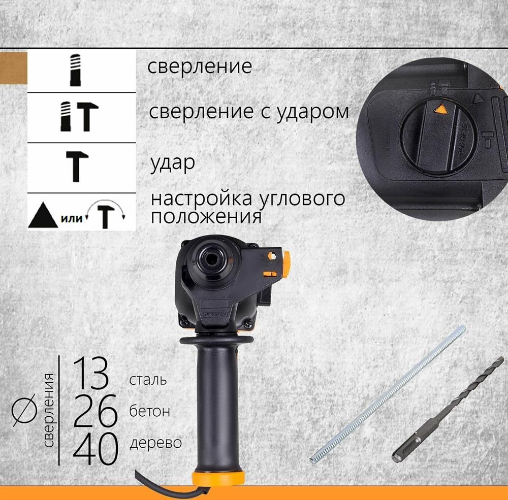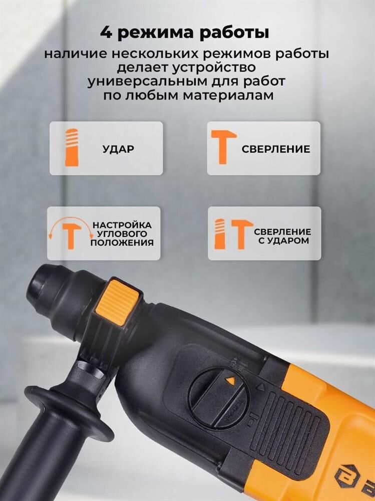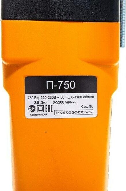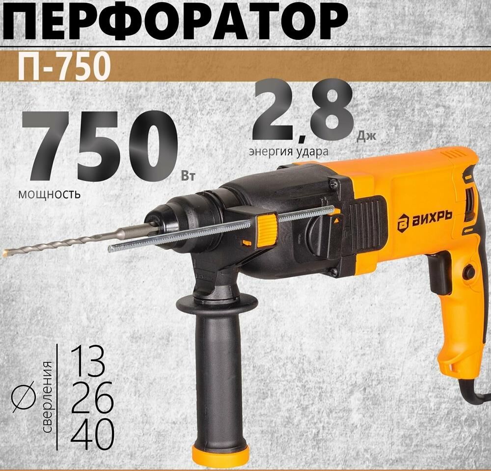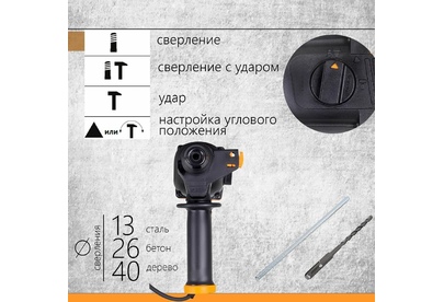 Мощность - 750Вт. Число ударов - 5200уд/мин. Сила удара - 2Дж. Макс. обороты - 1100об/мин. Количество скоростей - 1. Количество режимов - 3. Макс. диаметр бура - 40мм. Макс. диаметр сверления бетон/дерево/металл - 26/40/13мм. Тип патрона - SDS+. Возможности - наличие предохранительной муфты, режим долбления, регулировка числа оборотов.