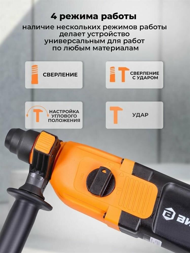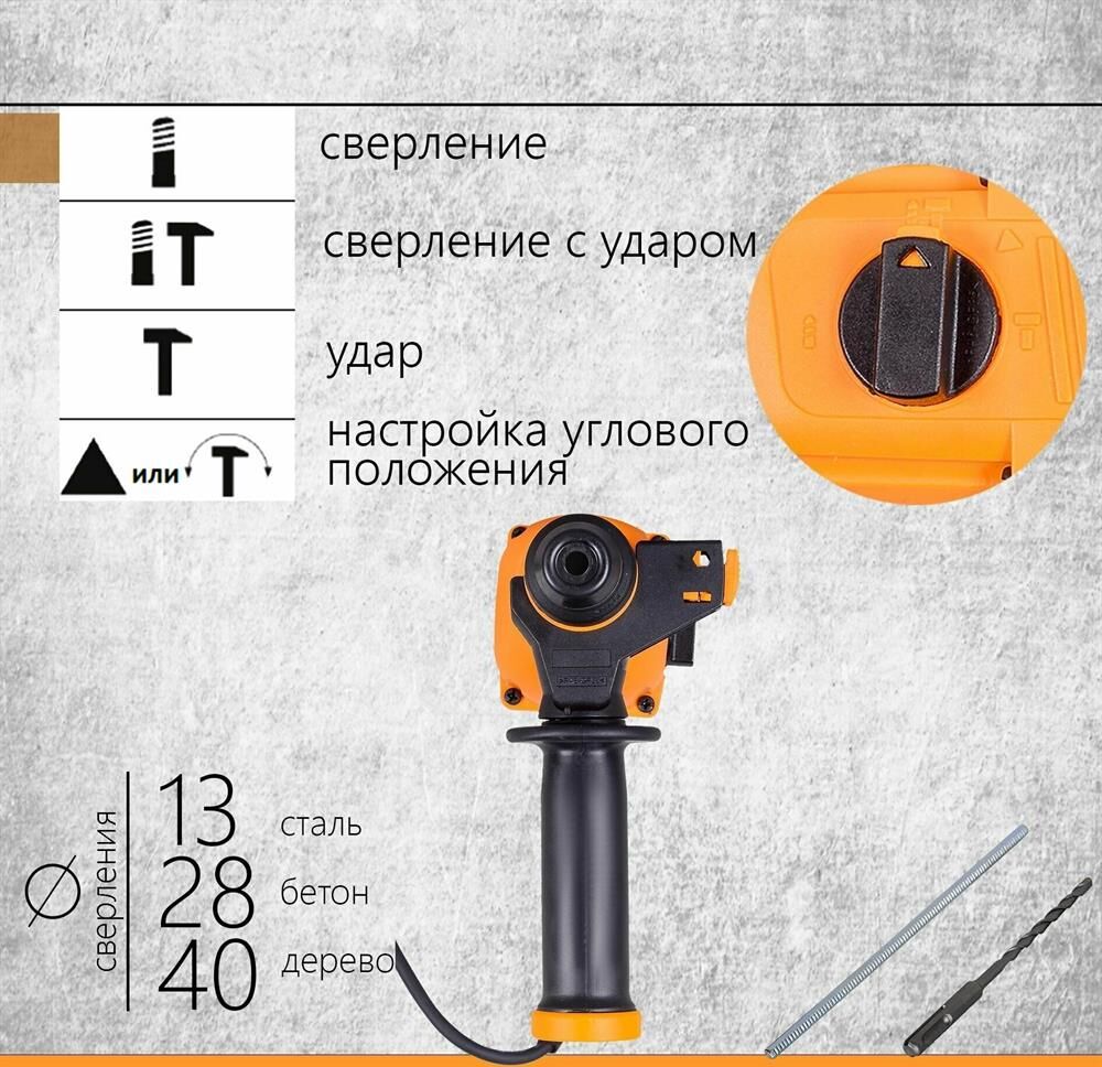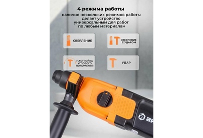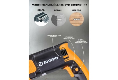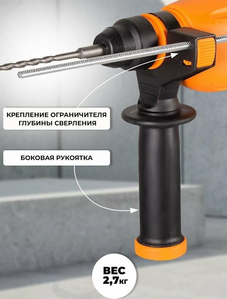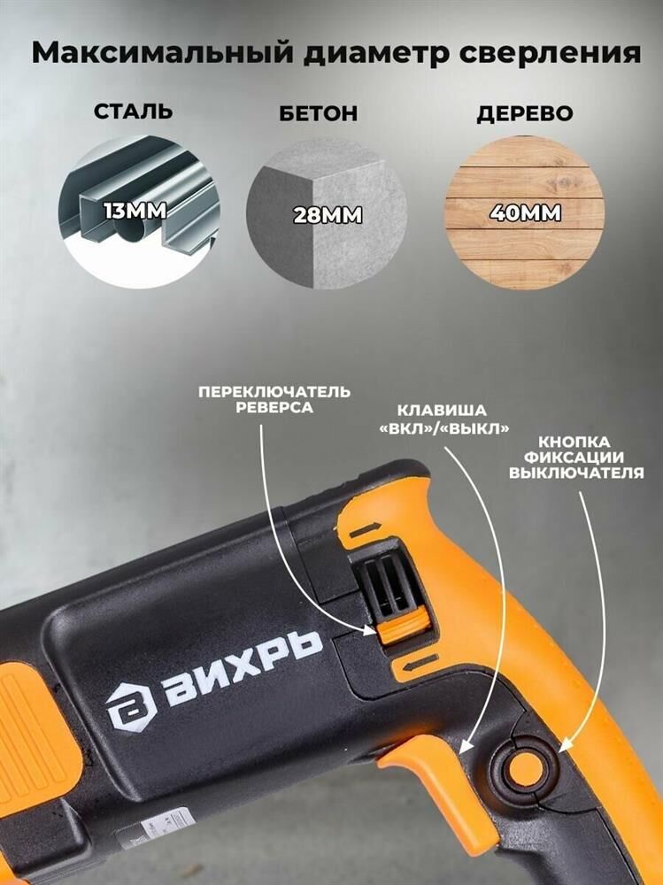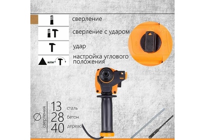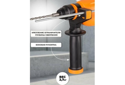 дополнительная рукоятка, ограничитель глубины сверления, блокировка кнопки включения