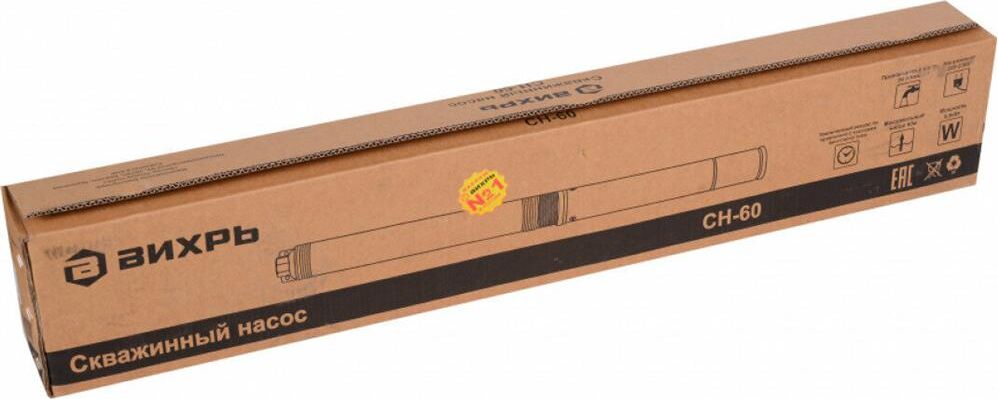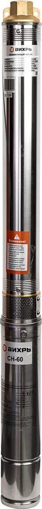 Скважинный насос ВИХРЬ СН-60. Мощность, Вт – 800; Диаметр насоса, мм – 75; Максимальная высота подъема, м - 60; Максимальная подача, л/мин – 50; Выходное отверстие, дюйм – 1;
