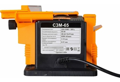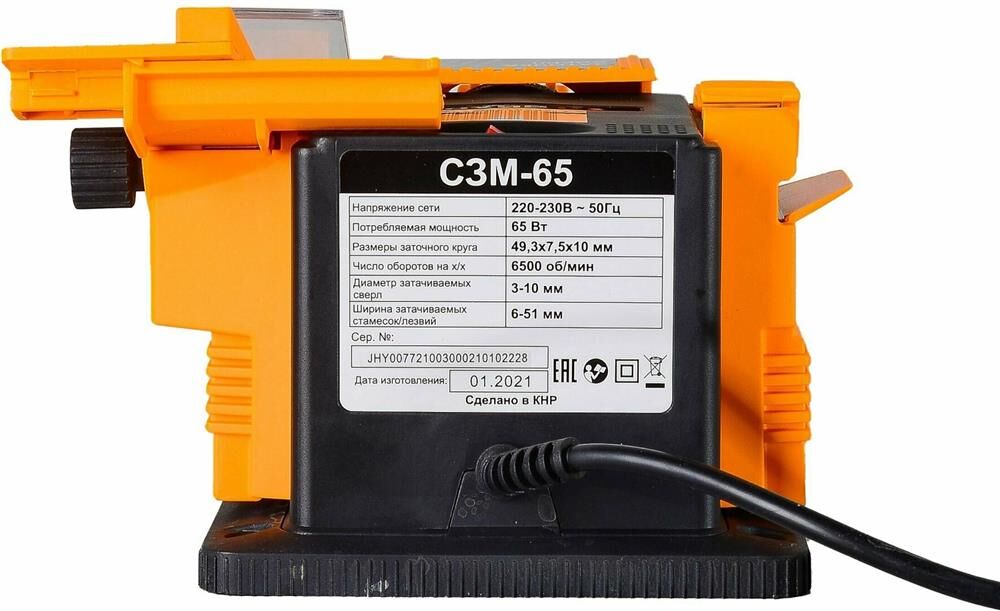 Напряжение питающей сети, В 220-230В, ~50 Гц; Мощность, Вт 65; Габариты упаковки 0.198 × 0.198 × 0.198 м; Размер заточного круга, мм 49,3х7,5; Частота вращения, об/мин 6500; Диаметр затачиваемых сверл, мм 3-10; Вес, кг 1.77 кг; Диаметр посадочного отверстия диска, мм 10; Ширина затачиваемых стамесок / лезвий, мм 6-51