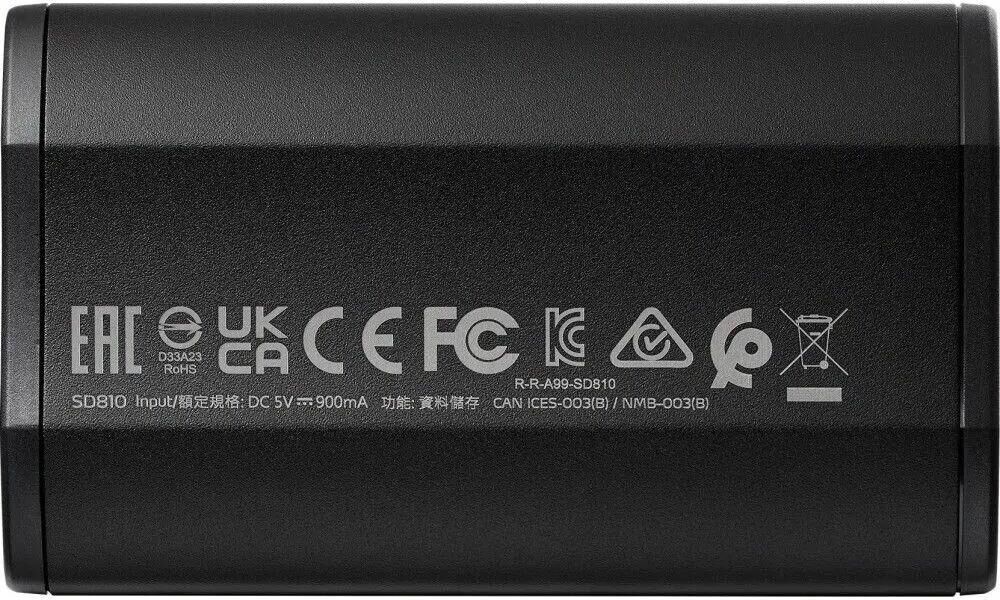 Количество дисков в устройстве: один. Объем накопителя: 500. Интерфейс подключения: USB-C. Форм-фактор диска: 1.8. Тип диска по исполнению: портативный. Особенности: Защита от воды, пыли и падений по стандарту IP68 Поддержка игровых консолей последнего поколения SD810 соответствует стандарту ударной прочности MIL-STD-810G 516.6. Электропитание: от порта USB. Материал корпуса: алюминий. Внешняя поверхность: матовая/глянцевая. Комплект поставки: Внешний диск, два кабеля (USB 3.2 Gen 2 Type-A и USB 3.2 Gen 2 x 2 Type-C), Краткое руководство. Максимальная скорость записи (Мбайт/с): 2000. Максимальная скорость чтения (Мбайт/с): 2000. Тип диска: SSD. Габариты упаковки (ед) ДхШхВ: 0.16x0.125x0.02. Вес упаковки (ед): 0.09. Пропускная способность интерфейса, до: 20 Гбит/с. Степень защиты: IP68/MIL-STD 810G. Гарантия: 36 мес.. Размеры (ШхВхГ): 44х72.7х12.24 мм. Цвет: черный. Вес: 41.7г. Поддержка ОС: Android, Linux, PS5, Windows, Xbox One, macOS. Защита от внешнего воздействия: водостойкий, противоударный. Разъемы и ин
