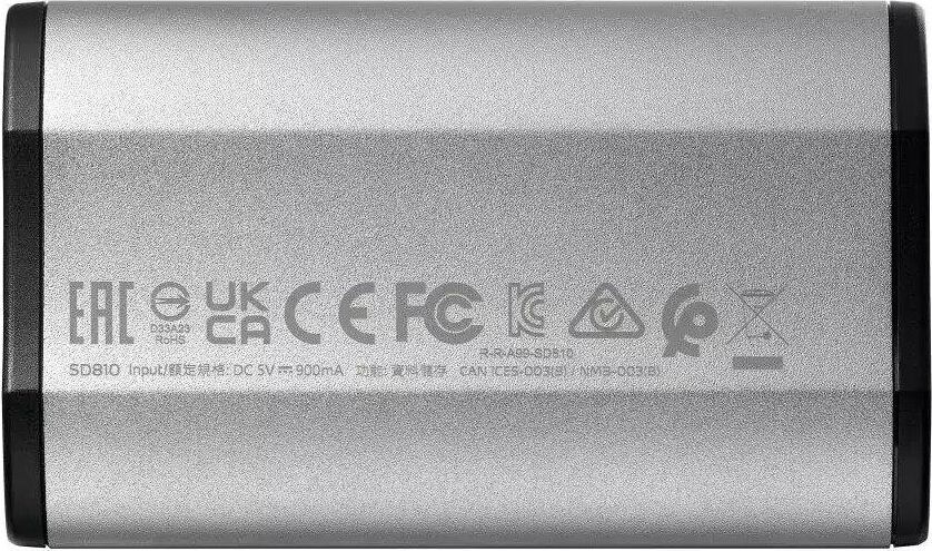 Количество дисков в устройстве: один. Объем накопителя: 500. Интерфейс подключения: USB-C. Форм-фактор диска: 1.8. Тип диска по исполнению: портативный. Особенности: Защита от воды, пыли и падений по стандарту IP68 Поддержка игровых консолей последнего поколения SD810 соответствует стандарту ударной прочности MIL-STD-810G 516.6. Электропитание: от порта USB. Материал корпуса: алюминий. Внешняя поверхность: матовая/глянцевая. Комплект поставки: Внешний диск, два кабеля (USB 3.2 Gen 2 Type-A и USB 3.2 Gen 2 x 2 Type-C), Краткое руководство. Максимальная скорость записи (Мбайт/с): 2000. Максимальная скорость чтения (Мбайт/с): 2000. Тип диска: SSD. Габариты упаковки (ед) ДхШхВ: 0.15x0.13x0.03. Вес упаковки (ед): 0.09. Пропускная способность интерфейса, до: 20 Гбит/с. Степень защиты: IP68/MIL-STD 810G. Гарантия: 36 мес.. Размеры (ШхВхГ): 44х72.7х12.24 мм. Цвет: серый. Вес: 41.7г. Защита от внешнего воздействия: водостойкий, противоударный. Поддержка ОС: Android, Linux, PS5, Windows, Xbox One, macOS. Разъемы и инте