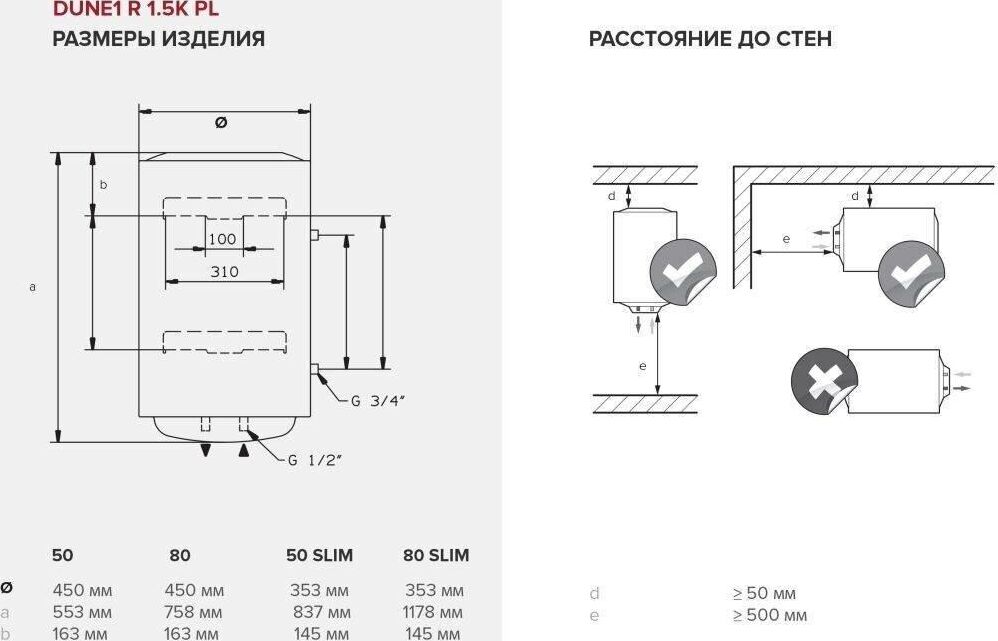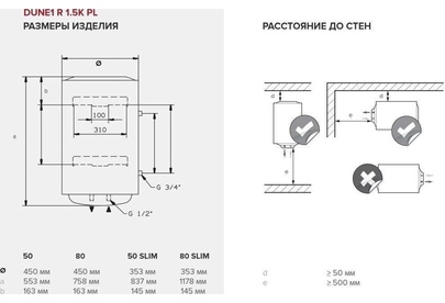 Способ нагрева Электрический Способ монтажа Настенный Способ установки Вертикальный Конструкция Форма корпуса Цилиндрический стандартный Материал корпуса Металл Цвет корпуса Белый Цвет нижней крышки Бежевый Управление Механическое Материал внутреннего бака Эмалированная сталь Покрытие внутреннего бака Эмаль TitanShield Количество внутренних баков шт 1 Количество нагревательных элементов шт 1 Тип нагревательного элемента Трубчатый Вид нагревательного элемента Мокрый ТЭН Подключение холодной воды Снизу Подключение горячей воды Снизу Технические характеристики Объем л 50 Мощность кВт 1,5 Количество режимов нагрева шт 1 Время нагрева всего объема ( T=45°С) ч, мин 1 ч 45 мин Тепловые потери при T=60°С кВт•ч за 24 ч 0,96 Максимальная температура нагрева воды °С 75 Минимальное давление воды бар 0,2 Максимальное давление воды бар 8 Напряжение В 230 Комфорт и безопасность Показ температуры нагрева Термометр Управление температурой нагрева Ручка регулировки Электропитание