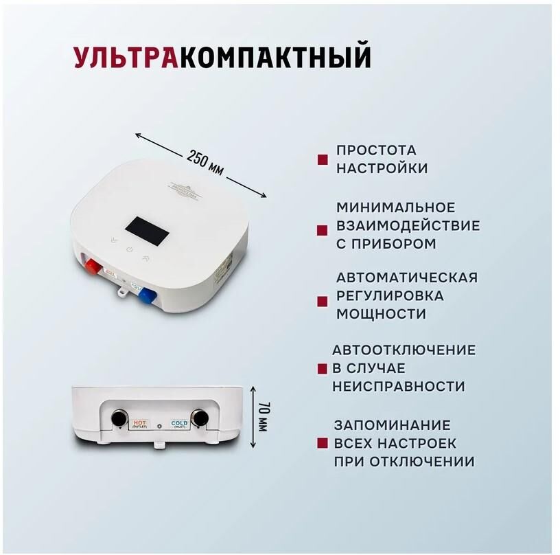 Технические характеристики Резьба для подключения воды 1/2 дюйма Мощность 5.5 кВт Напряжение сети 220(230) В Высота 230 мм Глубина 70 мм Ширина 250 мм Мах тем-ра нагрева воды 55 °С Управление сенсорное Самодиагностика да Цвет белый Защита от перегрева есть Производительность 5 л/мин Ограничение температуры нагрева есть Тип ТЭНа сухой Установка горизонтальная Способ крепления настенный Антизамерзание нет Форма прямоугольная Серия THERMA Габариты без упаковки 250х230х70 мм Вес нетто 3 кг Степень защиты от воды IPX4 IP Дисплей есть Индикация включения есть Способ подачи воды напорный Подводка нижняя