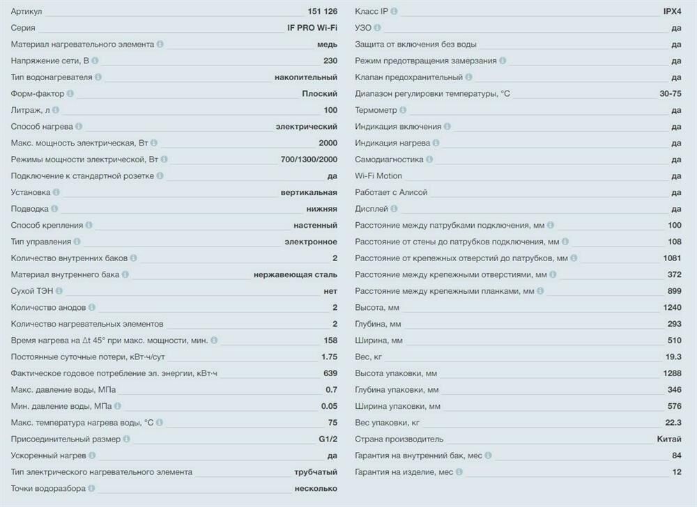 Объем 100 л, Мощность режимов нагрева 700/1300/2000 Вт, Время нагрева на t 45°С 157 мин, Макс. температура нагрева воды 75 С, Рабочее давление 0.05 – 0.7 мПа, Класс пылевлагозащиты IPX4, УЗО, Вес 18,8 кг, Стильная панель управления, Суперплоский корпус, стойкие к коррозии нержавеющие внутренние баки Нержавеющая сталь G.5, удобное сенсорное управление, Размер ВхГхШ 1240х268х510 мм.