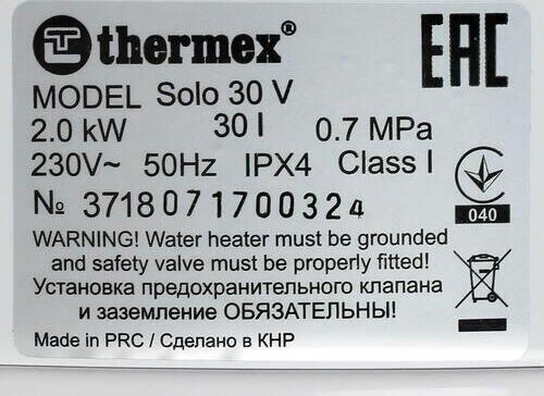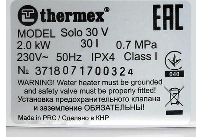 Серия SOLO, Объем 30 л, Макс. мощность 2000 Вт, Режим 2000 Вт, Напряжение сети 230 В, Установка вертикальная, Подводка нижняя, Способ крепления настенный, уравление механическое, 1 внутренний бак, материал внутреннего бака нержавеющая сталь, Материал нагревательного элемента нержавеющая сталь, Время нагрева на t 45° 40 мин, макс./мин. давление воды 0,6-0,05 МПа, Макс. температура нагрева воды 75 °С, Присоединительный размер G1/2, Класс IP IPX4, УЗО, Клапан предохранительный, ВхГхШ 530х355х340 мм, Вес 8,3 кг.