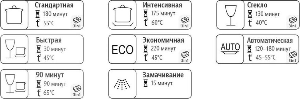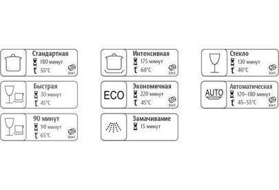 обычная программа для повседневного мытья, интенсивная программа для сильнозагрязненной посуды, экспресс-программа (быстрый цикл)