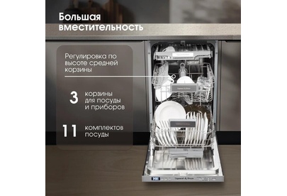 Общие параметры: Класс энергопотребления – А++ • Класс мытья – А++, класс сушки – А • 11 комплектов посуды • 3 корзины, 3 разбрызгивателя • Расход воды 9 л/цикл • Уровень шума 49 дБ • 7 программ мытья: Интенсивная (60°С, 185 мин) Стандартная (44°С, 238 мин) Быстрая (45°С, 40 мин) Стекло (40°С, 115 мин) 60 мин (50°С, 60 мин) Легкая (45°С, 143 мин) Предварительное полоскание (12 мин)