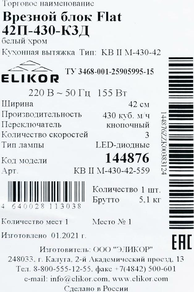 Встраиваемая вытяжка ELIKOR Врезной блок FLAT 42П-430-К3Д белый/хром