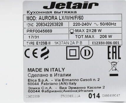 Встраиваемая вытяжка JET AIR AURORA LX/WH/F/60 Белый (PRF0045669)