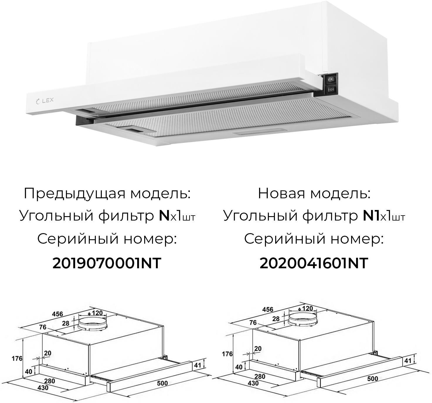 Свободный выход 570 — 650 м?/ч Вентиляция 490 – 570 м?/ч Рециркуляция 410 – 490 м?/ч Уровень шума 38 – 48 дБ Отделка Окрашенная сталь Количество скоростей 2 Управление Клавишное Освещение LED лампы 1 х 2,5 Вт Фильтр Алюминиевый (в комплекте), Угольный фильтр N/N1 * (х2) (опция) – *Фильтр N1 для моделей с серийными номерами начиная с 2020041601NT и далее Опции Мотор усиленной мощности, Тихий режим работы Диаметр воздуховода 120 мм Потребляемая мощность 102,5 Вт Давление 210 Па Ширина 500 мм Цвет White Вес в упаковке / без упаковки 6,5 кг / 5.5 кг Страна-производитель КНР Размер упаковки 335х565х225 мм.
