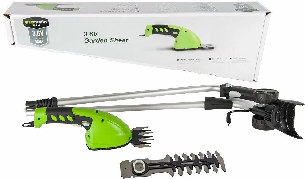 Длина основного ножа для кустов: 75. Ширина ножа для травы: 24. Тип электропитания: от аккумулятора. Емкость аккумулятора: 2. Напряжение аккумулятора: 3.6. Тип аккумулятора: Li-Ion. Индикатор заряда батареи: нет. Антиблокировочная система: нет. Защитное устройство ножа: нет. Защитный тормоз: нет. Ножи с алмазной заточкой: нет. Смена ножей без инструмента: нет. Комплект ножниц для травы и кустов: нет. Вес товара: 0.7. Комплект поставки: Ножницы аккумуляторные Greenworks G3,6GS 3,6V, Лезвие для травы с чехлом; Лезвие - кусторез с чехлом; Штанга - удлинитель; Зарядное устройство; Руководство по эксплуатации; Гарантийный талон.. Аккумулятор в комплекте: есть. Зарядное устройство в комплекте: есть. Габариты упаковки (ед) ДхШхВ: 0.75x0.23x0.12. Вес упаковки (ед): 4.5. Гарантия: 12 мес.. Ширина ножа для травы: 24 мм. Вес: 0.7 кг. Длина основного ножа для кустов: 75 мм. Электропитание: от аккумулятора. Аккумулятор: Li-Ion, 3.6 В; 2 Ач