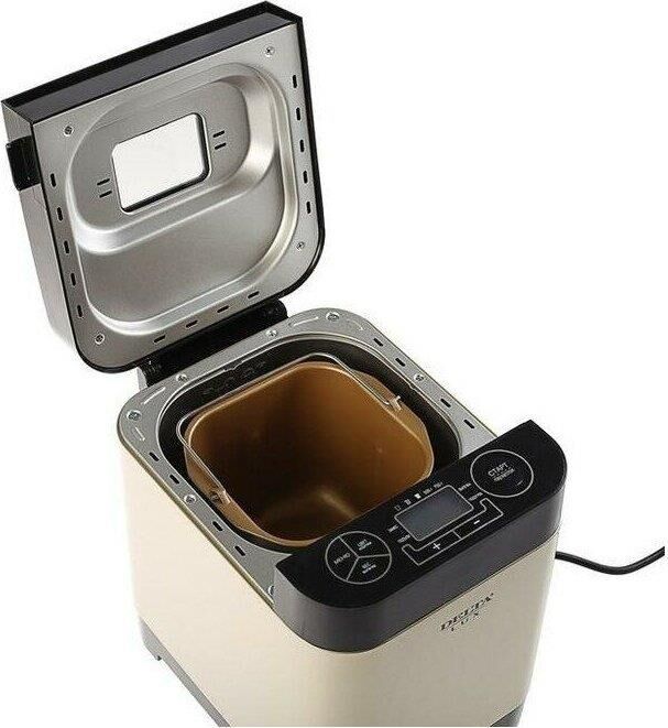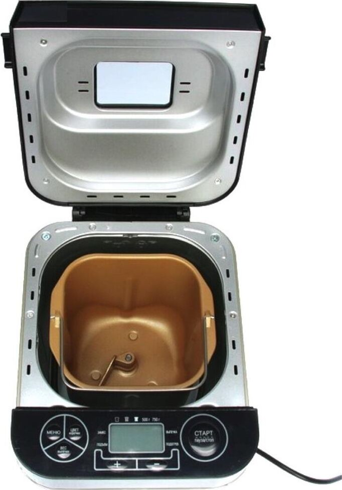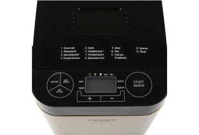Параметры Номинальная потребляемая мощность 500 Вт Вес выпечки 500/750?г Объем формы для выпечки 0,7 л Объем?мерного?стакана 0,2?л Описание Прибор предназначен для выпекания хлебобулочных изделий, замеса теста для последующей выпечки в духовке, а также для приготовления джема и варенья в бытовых и аналогичных условиях Корпус из высококачественной нержавеющей стали и пластика Цвет: золотистый с черным Форма для выпечки и тестомешалка с антипригарным покрытием Сенсорная панель управления LCD-дисплей Мерный стакан 200 мл Двухсторонняя мерная ложка: 1 чайная ложка и 1 столовая ложка Функция «Отложенный старт» до 13 часов Функция сохранения тепла «Автоподогрев» 1 час Энергонезависимая память до 10 минут Выбор веса выпечки: 500 г/750 г Выбор цвета корочки: светлая, средняя, темная Возможность добавления дополнительных ингредиентов Звуковые сигналы, сопровождающие процесс приготовления 13 автоматических программ выпечки?и?приготовления: белый хлеб французский хлеб цельнозерновой хлеб быстрая выпечка сдоба ультрабыст
