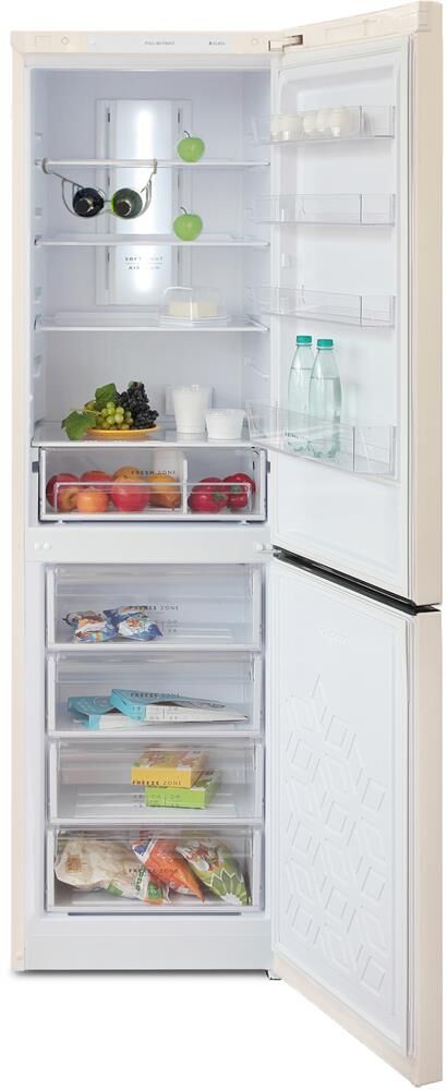 Двухкамерный холодильник с нижней морозильной камерой с системой Full No Frost с дисплеем на двери • габариты 207х60х62,5см • объем 370/240/130л• цвет Бежевый • LED дисплей на двери • система охлаждения Multi Air Flow • регулировка влажности Humidity control • единая зона для овощей и фруктов Fresh Zone с разделителем • полка для бутылок, масленка • LED освещение •