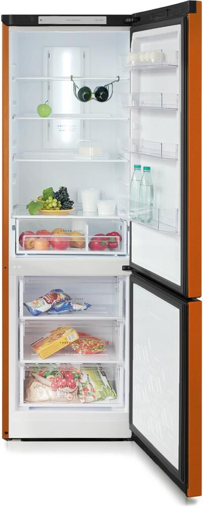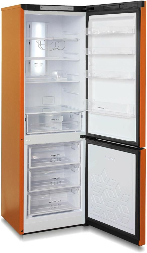 Двухкамерный холодильник с нижней морозильной камерой; Цвет: Оранжевый; Габариты ВхШхГ: 194х65х62,5см; Общий объем: 340л; Система Full No Frost; Система Air Flow; Класс энергоэффективности: A; Возможность перевешивания двери; Автономное сохранение холода: 17 ч; Минимальная температура в морозильной камере: -18 °C; Управление: LED дисплей; Количество ящиков в морозильном отделении: 3; Объем холодильной камеры: 240 л; Объем морозильной камеры: 100 л; Материал полок: стекло/пластик; Количество ящиков в холодильном отделении: 1; Суточный расход электроэнергии, при температуре окружающего воздуха 24°C: 1.03 кВтч; Количество полок в холодильном отделении 4 Температура в отделении для хранения свежих пищевых продуктов: От 0 до 8 °C; Мощность замораживания: 3 кг/сутки; Размораживание морозильной камеры: No Frost; Климатический класс: N,ST; Максимальный уровень шума: 43 дБ; Количество компрессоров: 1; Освещение: LED