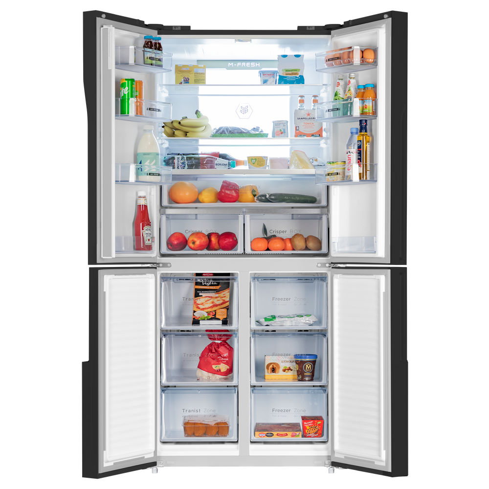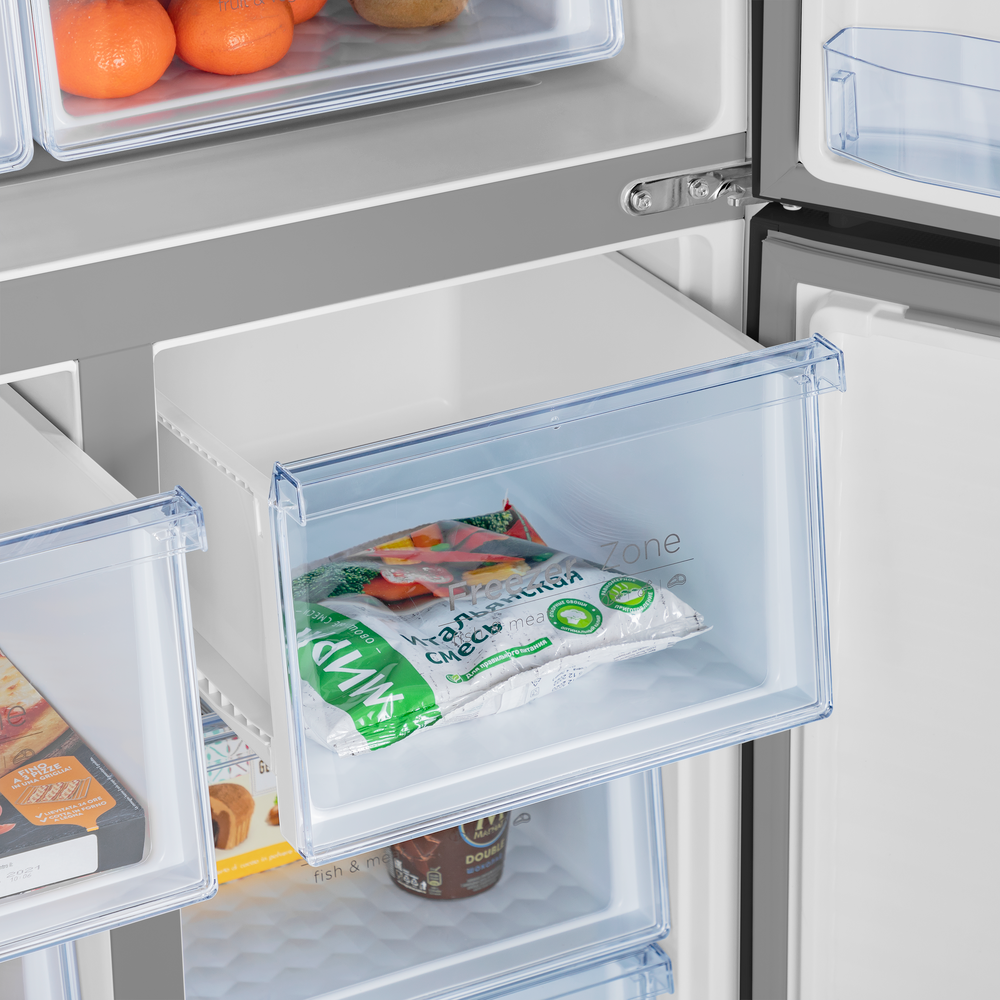 Холодильник Maunfeld MFF181NFB выполнен в черном цвете и имеет встроенный дисплей. Такая модель идеально будет смотреться в любом кухонном интерьере и покажет его индивидуальность и особенность. Техника подойдет для большой семьи, ведь ее высота равна 181,1 см, ширина — 78,3 см, глубина — 70,9 см. Функция «Суперзаморозка» позволяет понизить температуру в морозильном отделении до минимума и удерживать ее на этом уровне в течение продолжительного времени. Благодаря этому помещенные внутрь продукты замораживаются быстро, эффективно и равномерно, а значит, лучше сохраняют свою структуру и содержащиеся в них полезные вещества и витамины. Система NoFrost — конструктивное решение, при котором испаритель внесен в отдельный отсек, где и происходит охлаждение воздуха. Благодаря такой компоновке в морозилке снижается влажность, а значит вода не превращается в наледь. Ко встроенным настройкам холодильника Maunfeld MFF181NFB относится «Отпуск», который полезен, если требуется надолго отлучиться из дома или кварт