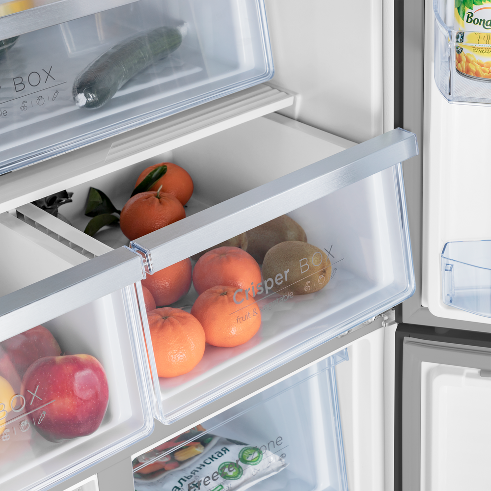 Холодильник Maunfeld MFF181NFSB — отдельно стоящий холодильник, предусматривающий морозильную камеру и 4 дверцы. Модель выполнена в черном цвете, поэтому подойдет к любому интерьеру кухни. Размеры техники: высота — 181,1 см, ширина — 78,3 см, глубина — 70,9 см. Данный товар может похвастаться большим полезным объемом, он составляет 474 л, при этом 320 л приходится на холодильное отделение, а 164 л — на морозильное. Благодаря этому Вы теперь можете не беспокоиться о том, что все продукты не поместятся — в холодильник Maunfeld MFF181NFSB вместится все. Суперохлаждение — функция холодильной камеры, при активации которой вентилятор направляет потоки холодного воздуха во все углы рабочего пространства — припасы охлаждаются быстро и равномерно. Суперзаморозка позволяет понизить температуру в морозилке до минимума и удерживать ее на этом уровне в течение продолжительного времени. Благодаря этому помещенные внутрь продукты замораживаются быстро, эффективно и равномерно, а значит, лучше сохраняют свою структуру и