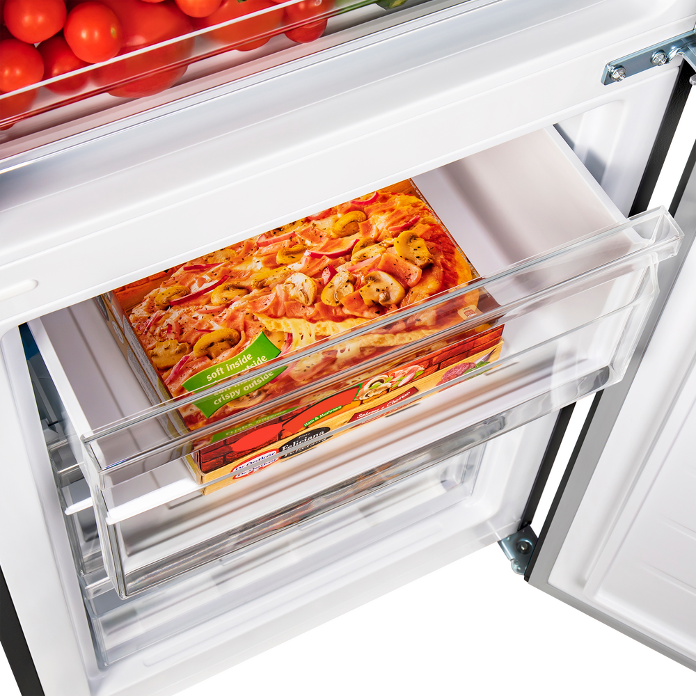 Холодильник Maunfeld MFF185SFSB имеет размеры 59,5×185,5×59,5 см. Модель представлена в черном цвете, поэтому она будет гармонично смотреться в любом кухонном интерьере. В ее основу положен надежный и экономичный инверторный компрессор, соответствующий классу А+. Классификация по уровню энергопотребления дает объективное представление о том, насколько эффективно устройство расходует данный ресурс. Управление осуществляется с помощью сенсорных переключателей, которые будут доступны и понятны абсолютно каждому. На встроенном дисплее вы сможете видеть температуру. Объем холодильника Maunfeld MFF185SFSB составляет 252 л, холодильное отделение может включать в себя 211 л, а морозильное — 104 л. Морозилка предусматривает 3 ящика и способна замораживать продукты до 5 кг. Данная техника идеально подойдет для семьи из 3-4 человек и вместит в себя все необходимые запасы. Прибор работает очень тихо: громкость издаваемых им звуков не превышает 39 дБ, поэтому его работа не помешает вашему разговору на кухне.