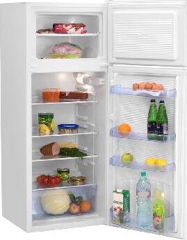(ВхШхГ) 146х57х62см. 2-камерный, морозилка сверху. 1 компрессор. Общий объем 261л, холод. камеры 210л, мороз. камеры 51л. Автомат. разморозка. Управл-е механич. Класс энергопотребления A+. Цвет белый.