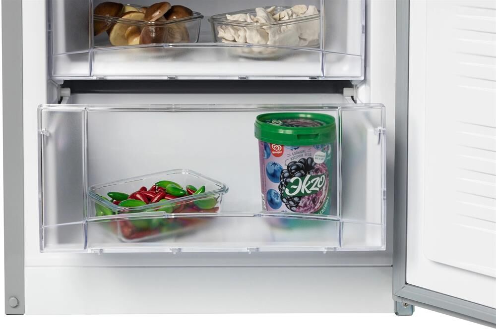 Двухкамерный отдельностоящий холодильник NORDFROST NRB 162NF с нижним расположением морозильной камеры имеет общий объем 310 л. Модель выполнена в стильном и лаконичном дизайне. Холодильник высотой 188 см подойдет в интерьер, как современной, так и классической кухни. Модель с системой охлаждения Frost Free сочетает капельную систему оттаивания в холодильном отделении и систему размораживания No Frost в морозильном. Воздух, циркулирующий в камерах, не смешивается, благодаря чему показатели температуры и влажности остаются неизменными и комфортными для лучшего сохранения продуктов. Морозильная камера объемом 105 л имеет мощность заморозки до 3,5 кг в сутки. На стенках морозильника не образовывается наледь и иней, что навсегда избавит пользователя от ручного размораживания. Холодильник характеризуется высоким классом энергоэффективности А+ и низким уровнем шума до 41 дБ. Холодильник оснащен LED-освещением в холодильной камере, которое не выделяет тепло во внутреннее пространство холодильника, а также отличается