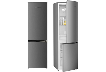 Двухдверный холодильник серии COMBI, морозильная камера снизу. No Frost, полезный объем 237 (182+55) литров, А+ класс, 42 дБ, R600а, N-ST, LED подсветка, потребление энергии 256 кВт/год, мощность замораживания 2,5 кг/сутки. Холодильное отделение: 3 полки из стекла, 3 боковых полки, 1 большой ящик для овощей и фруктов. Морозильное отделение: 2 выдвижных ящика, 1 лоток с легким доступом. Вес нетто и брутто 51 и 55 кг, цвет нержавеющая сталь. Регулируемые ножки, перенавешиваемые двери, интегрированные ручки.