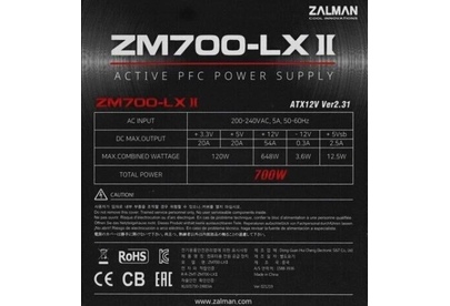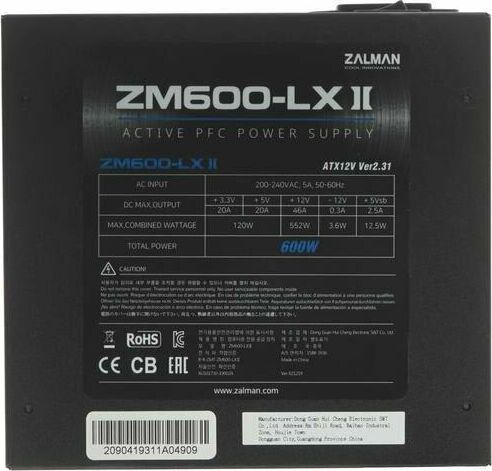 ZALMAN Блок питания 600W ZM600-LXII black (ATX, APFC, 20+4P, 2xPCIe 6+2P, 3хMolex, 6xSATA, 120mm fan