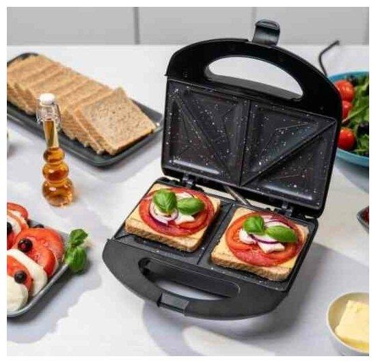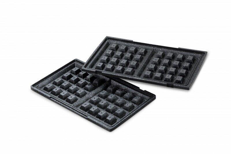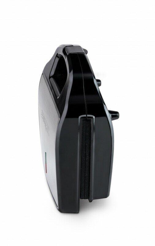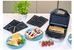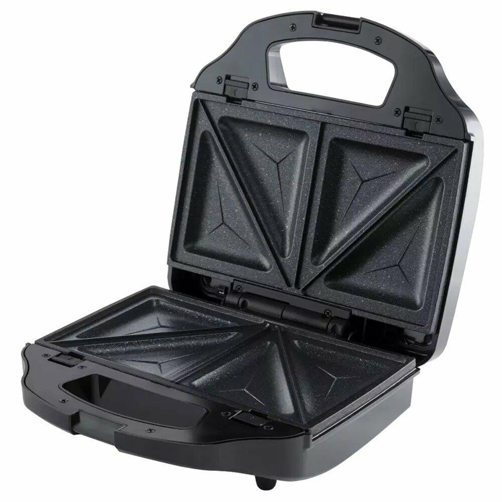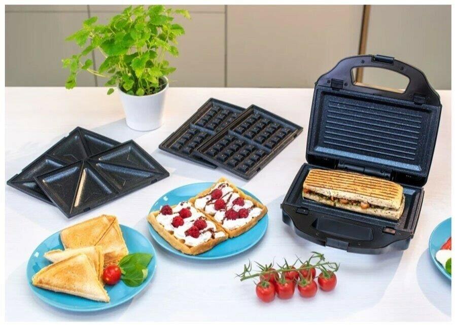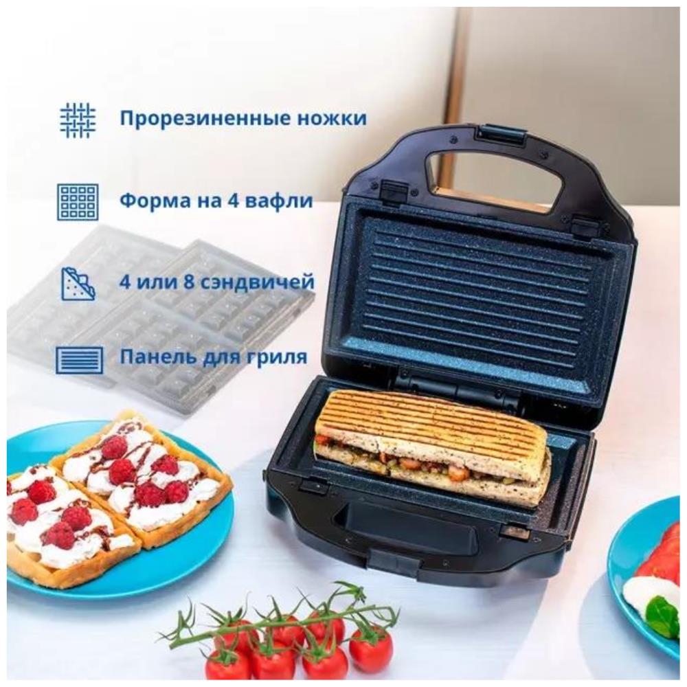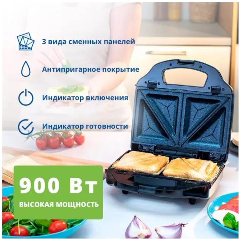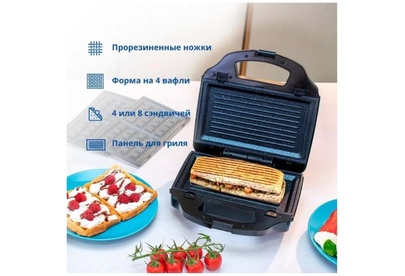 Мощность 900 Вт; антипригарное покрытие на 4 сендвича; возможность работы в вертикальном состоянии; 3 набора съёмных пластинЖ для сэндвичей, для вафлей, для гриля