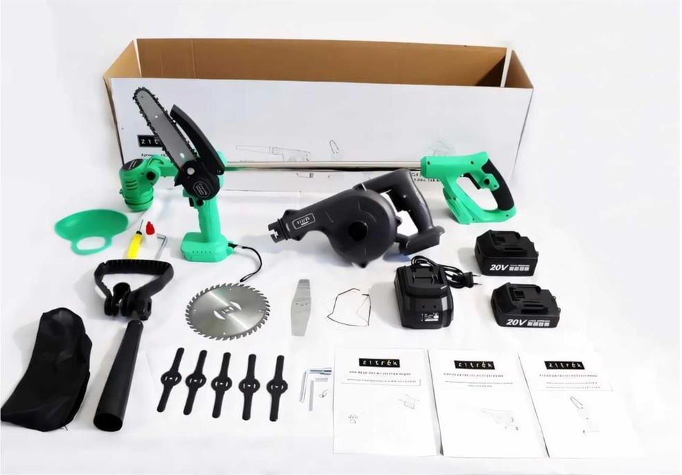 Технические характеристики GreenCut 20: Скорость вращения без нагрузки: 10000 об/мин Диаметр резки: 150 мм Напряжение батареи: 20 В Емкость батареи: 2000 мАч Время зарядки: 120 мин Время работы без нагрузки: 60-80 мин Длина штанги: 90-120 см Технические характеристики GreenSaw 20 Extra Power: Тип АКБ: Li-Ion Напряжение АКБ: 20 В Длина шины: 152 мм Скорость вращения цепи: 5 м/с Двигатель: щеточный Количество скоростных режимов: 1 Технические характеристики ZKBL20: Напряжение АКБ: 20В Емкость АКБ: 4000мАч Количество АКБ в комплекте: 1 Объем воздуха: 2,7м3/мин Скорость воздуха: 60м/с