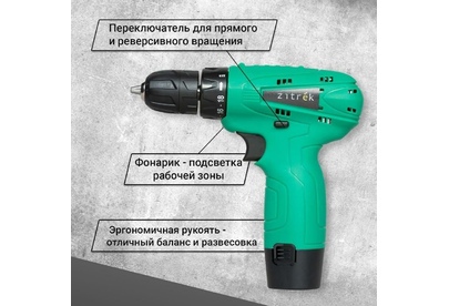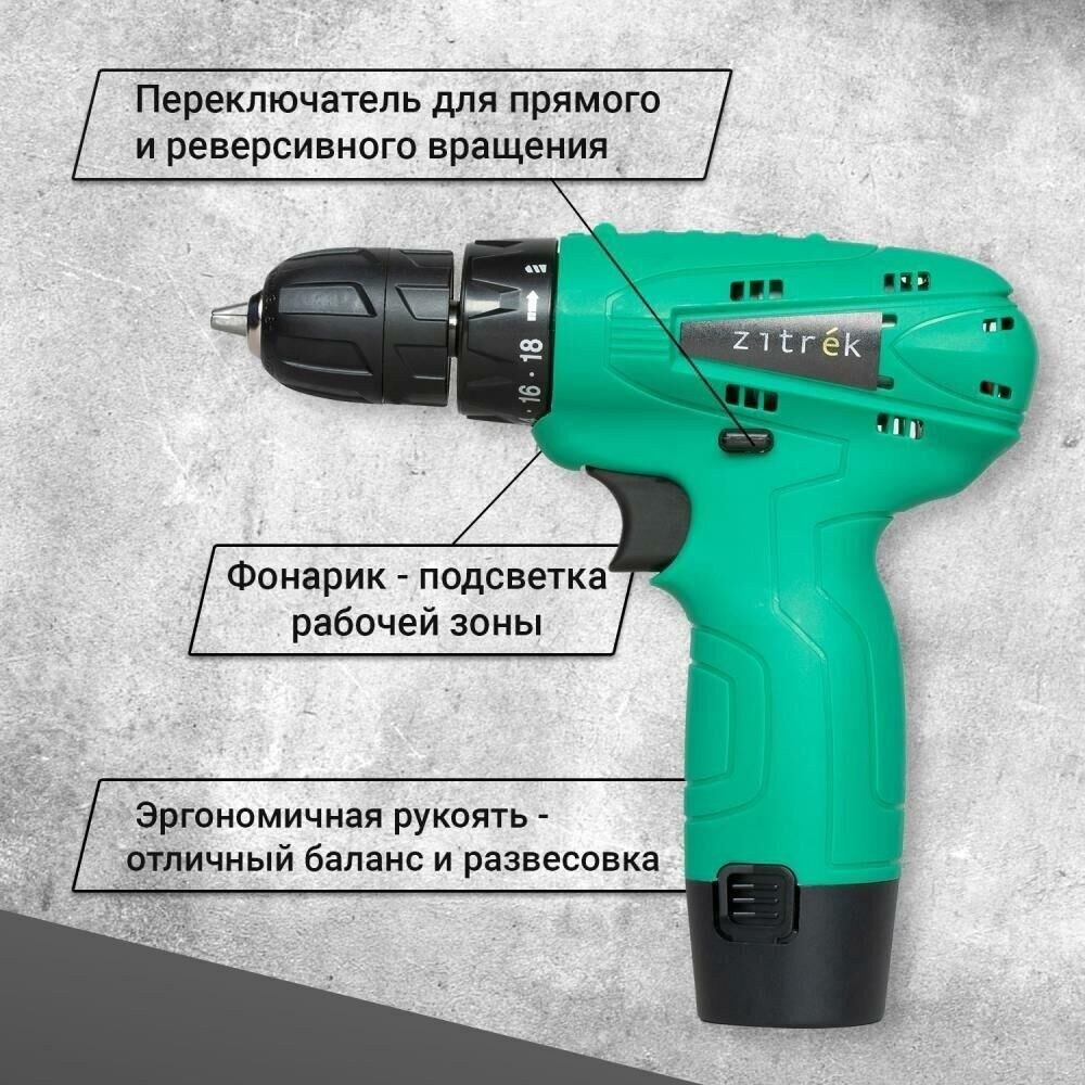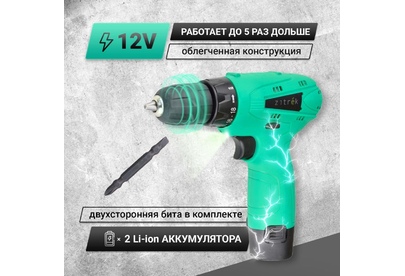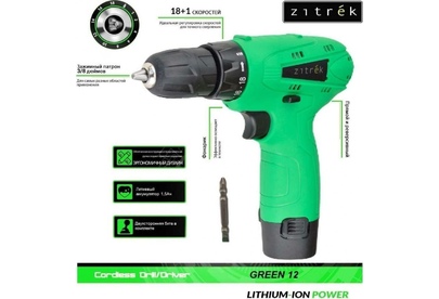 ZITREK Green 12-Li (12В, Li-ion аккумулятор 2шт, ЗУ, бита, кейс) 063-4072