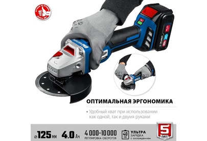 Напряжение изделия, В 20. Диаметр диска, мм 125. Посадочный диаметр, мм 22.2. Число оборотов, об/мин 4000 / 6000 / 8000 / 10000. Электронная регулировка оборотов есть. Резьба шпинделя М14. Тип аккумулятора Li-Ion. Емкость аккумулятора, А·ч 4.0. Индикатор заряда батареи есть. Плавный пуск есть. Поддержание постоянных оборотов под нагрузкой есть. Защита от перегрузки есть. Тормоз вала есть. Защита от повторного включения есть. Защита при заклинивании диска есть. Защита от непреднамеренного пуска есть. Регулировка положения кожуха без инструмента есть. Фиксация кнопки включения есть. Дополнительная рукоятка есть. Антивибрационная основная рукоятка нет. Поворотная голова есть. Поворотная основная рукоятка нет. Суперфланец есть. Быстрозажимная гайка sds нет. Тип двигателя BRUSHLESS, бесщеточный. Количество аккумуляторов 2. Зарядное устройство импульсное. Время заряда батареи, ч 0.5. Напряжение питания зарядного устройства, В/Гц 230/50. Габариты, см 37x31x11.