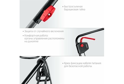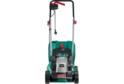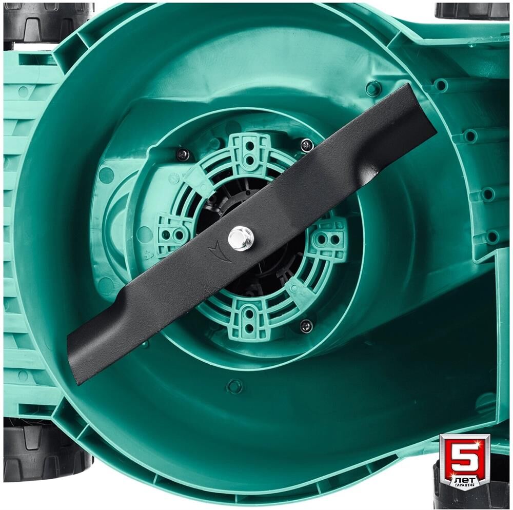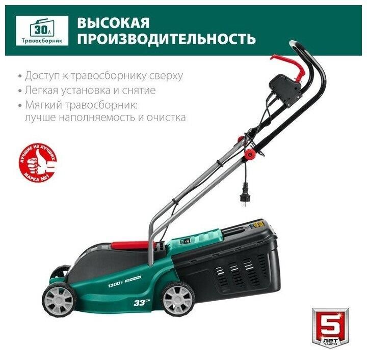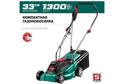 Тип двигателя: электрический. Мощность двигателя: 1300. Режущая система: нож. Ширина скашивания: 33. Система регулировки высоты скашивания: 3 уровня, осевая. Тип выброса травы: задний выброс. Тип травосборника: жесткий. Объем травосборника: 35. Количество колес: четырехколесная. Материал колес: пластик. Тип электропитания: от электросети. Вес товара: 9. Комплект поставки: Газонокосилка, травосборник, рукоятка верхняя, рукоятка нижняя, комплект крепежа, руководство по эксплуатации.. Особенности: Удобное средство для кошения газона на небольшом участке. Прекрасная альтернатива бензиновой газонокосилке: меньшее потребление энергии при той же режущей способности, отсутствие необходимости постоянной покупки ГСМ и контроля уровня топлива и масла, простота эксплуатации и ремонта.. Тип передвижения: несамоходное. Класс защиты: II. Класс защиты корпуса: IPX4. Габариты упаковки (ед) ДхШхВ: 0.571x0.4x0.31. Вес упаковки (ед): 16.33. Гарантия: 24 мес.. Высота скашивания: 20 - 60 мм. Размеры: 56 х 31 х 40 см. Особенности у